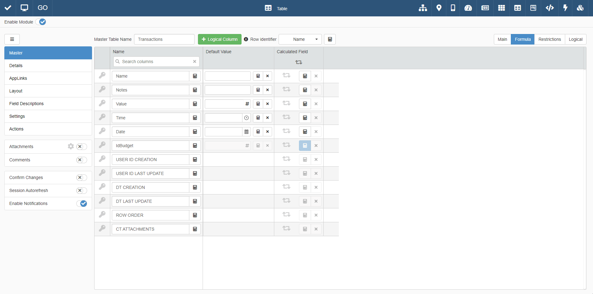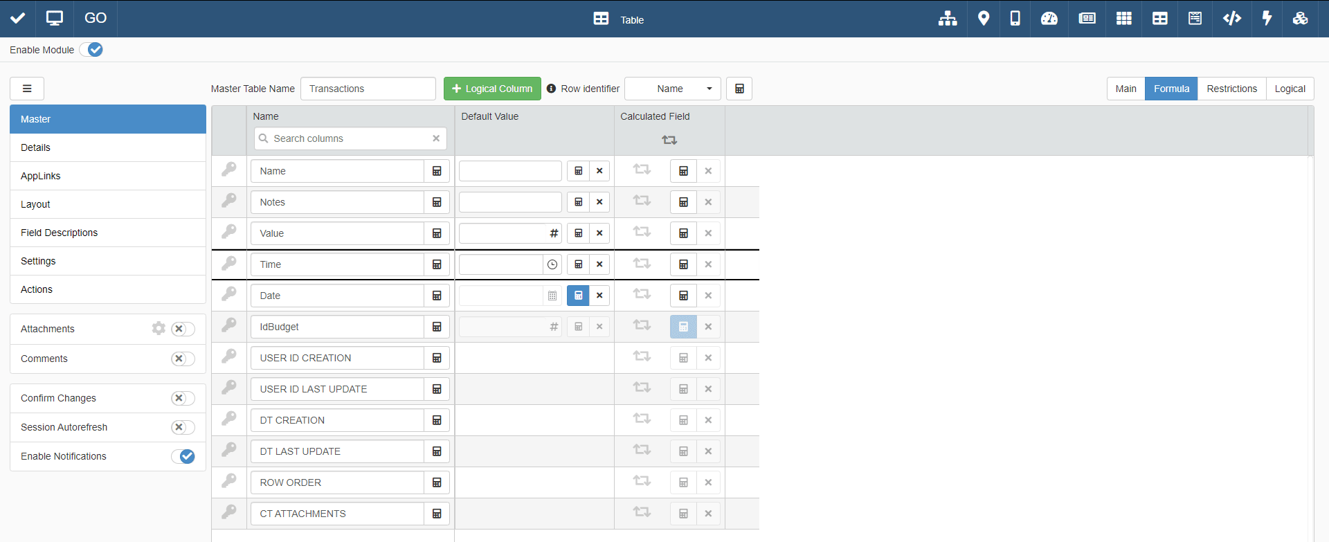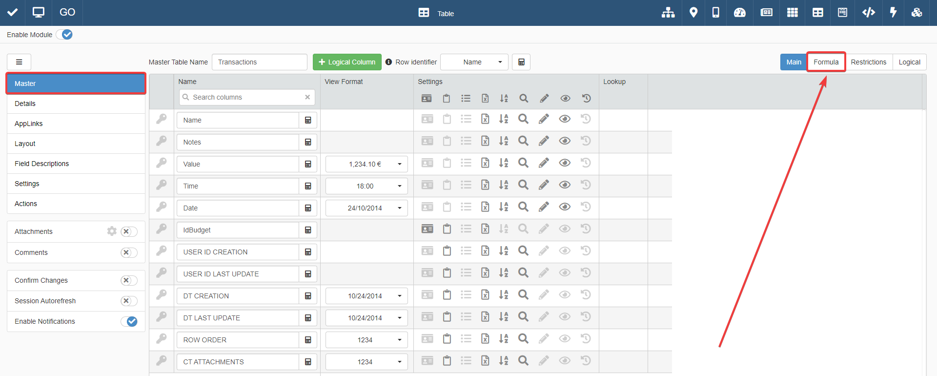 The Formula tab of Master enables you to insert formula for values of fields.