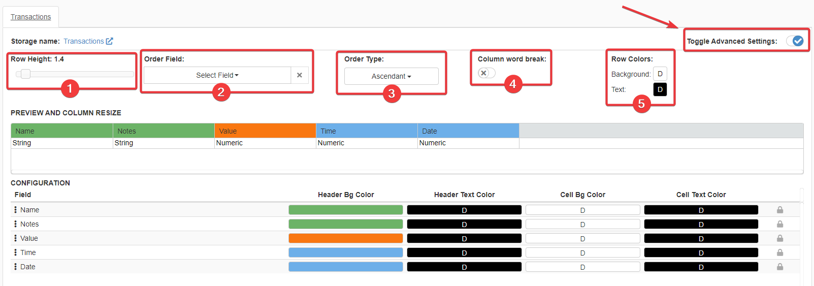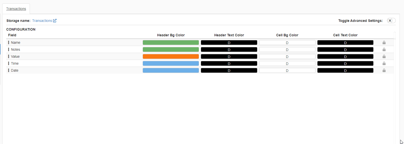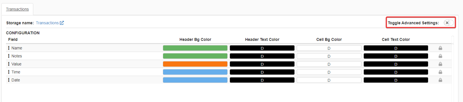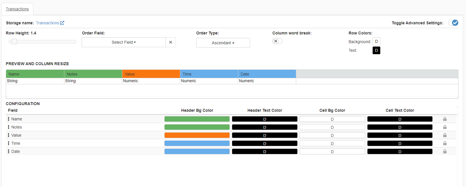 - Row Colors Enables to choose colors for the whole row and the cell's text.