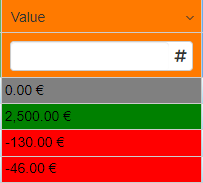 =IF( =LT($CURRENTSTORAGE.BudgetValue; 0); "red"; =IF( =GT($CURRENTSTORAGE.BudgetValue; 0); "green"; "gray" ) )The formula checks if the cell value is lower than 0.