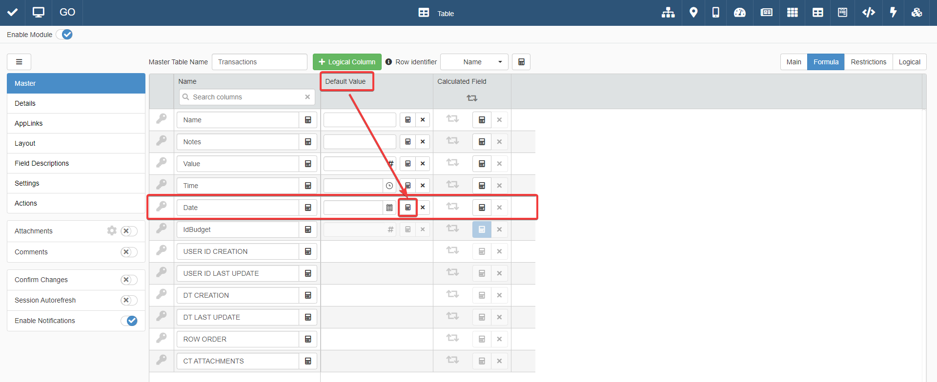 Under the Default Value column in correspondence of the Date field, click on the Create default value formula button (). The action opens the formula editor for the default value.