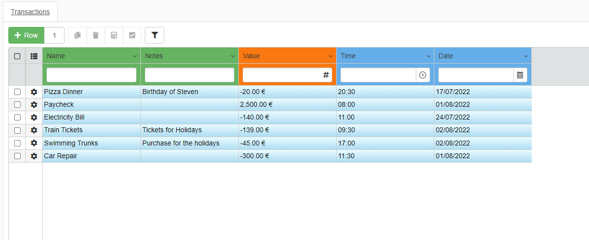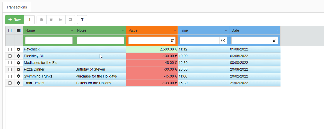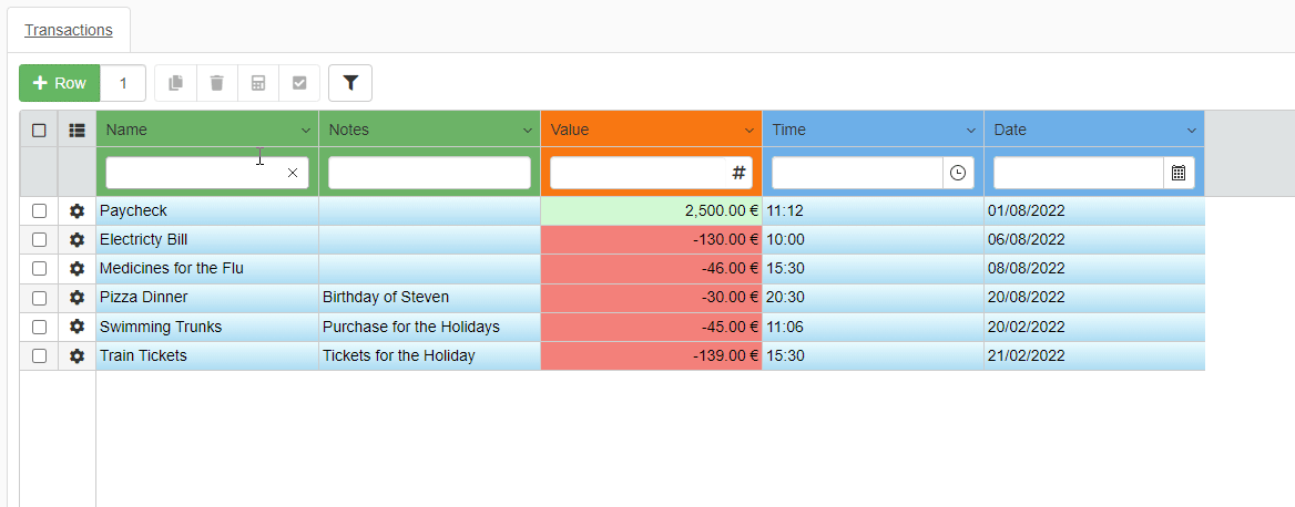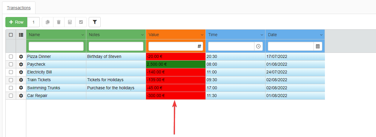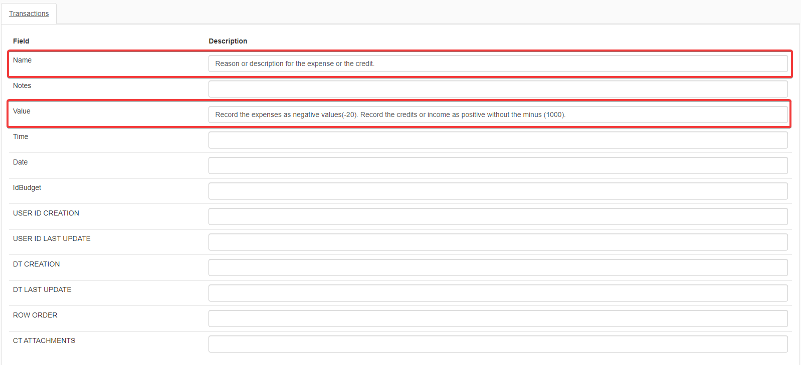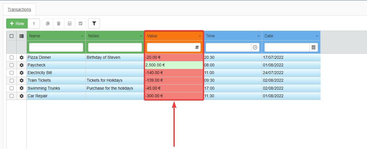 - Value: Record the expenses as negative values (-20). Record the credits or income as positive without the minus (1000).