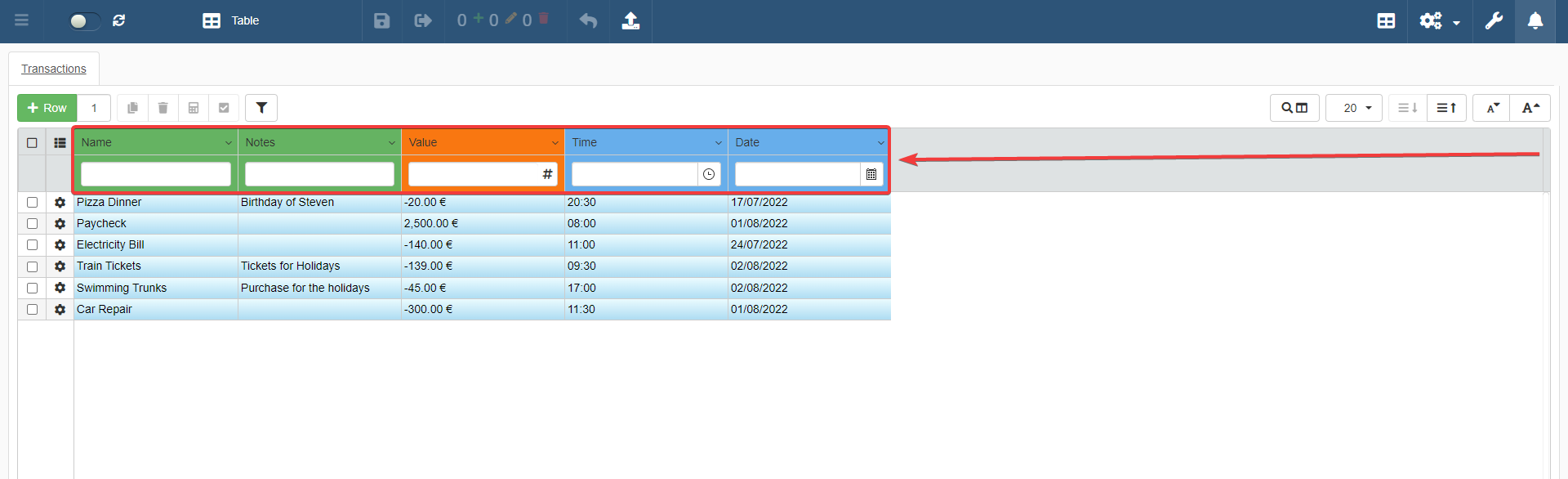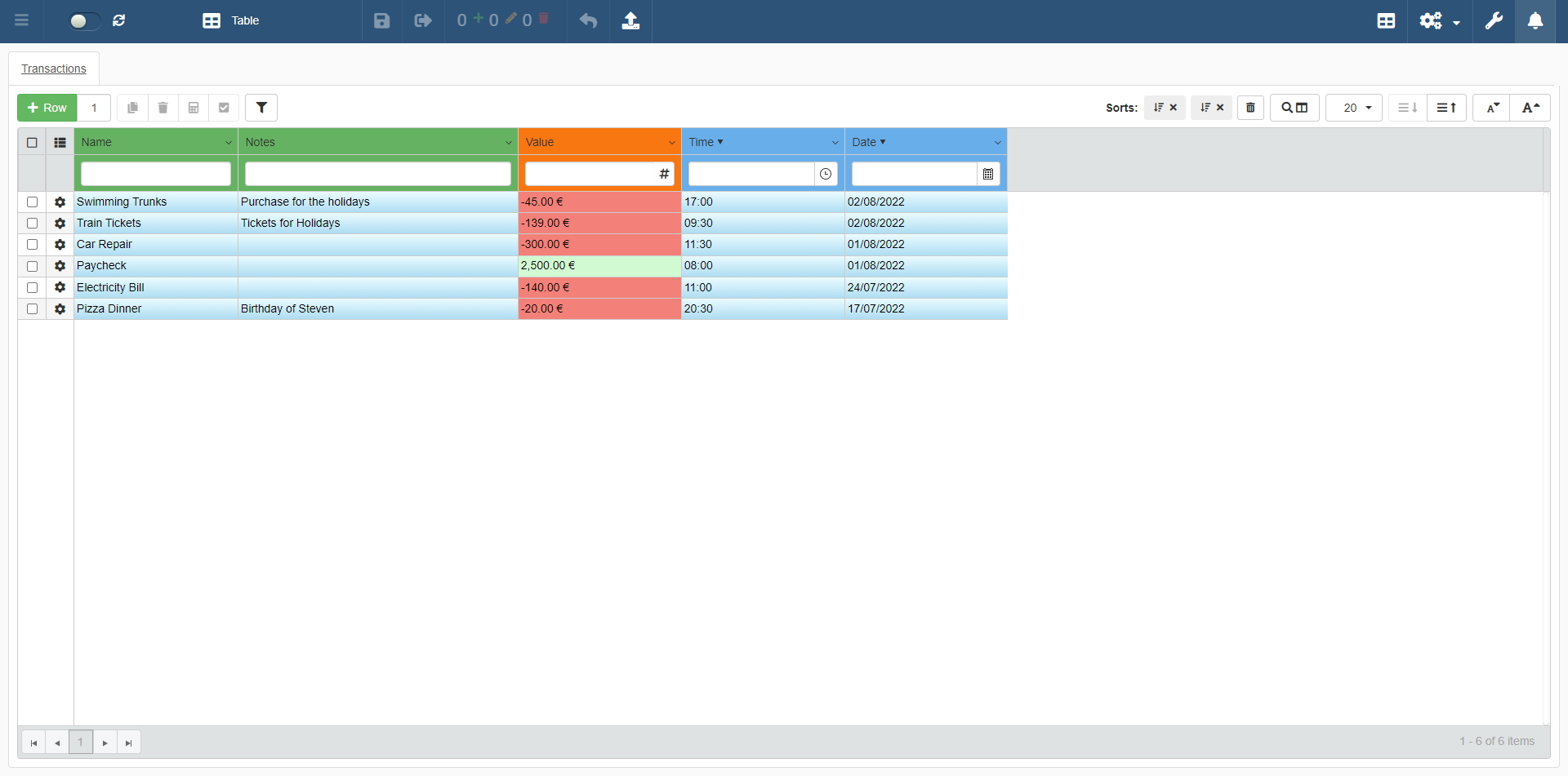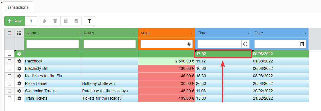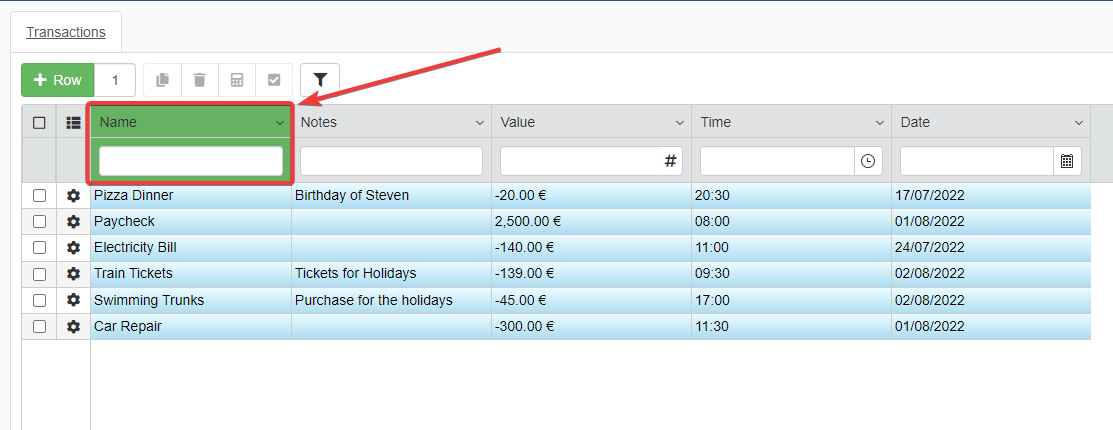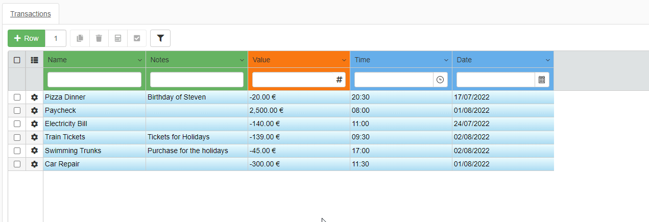 - Value: Record the expenses as negative values (-20). Record the credits or income as positive without the minus (1000).