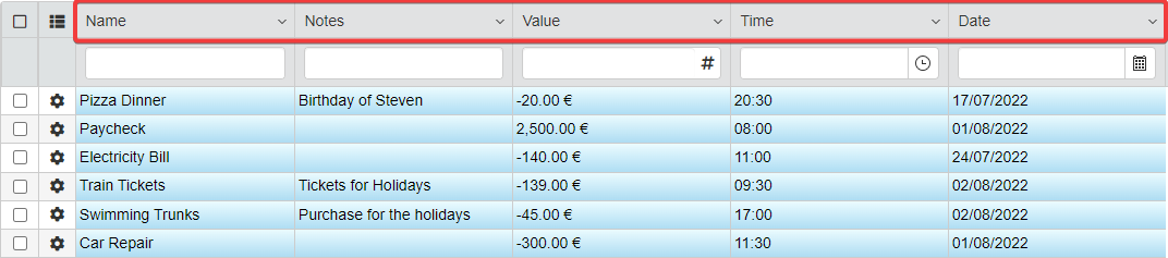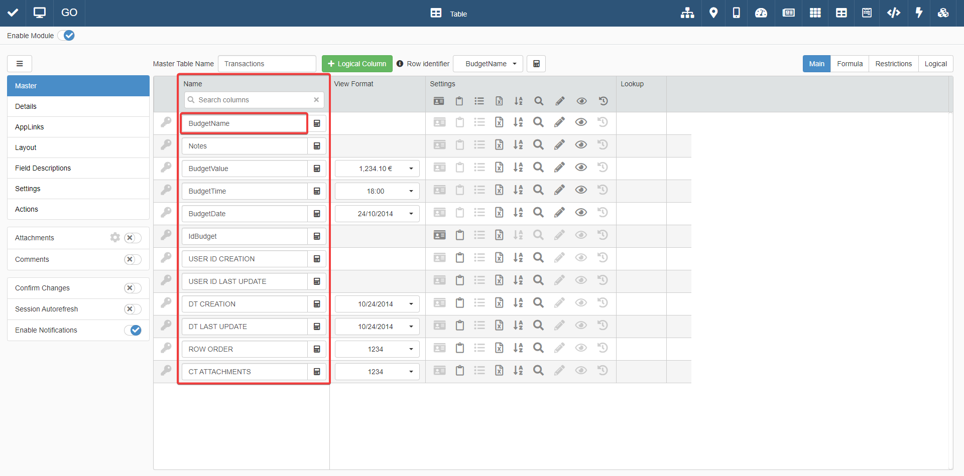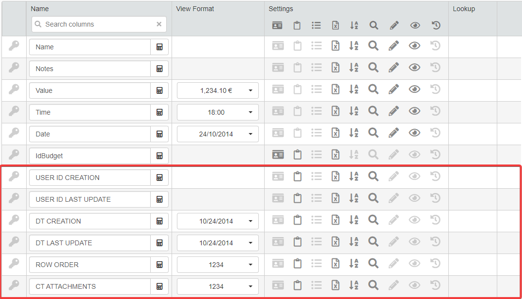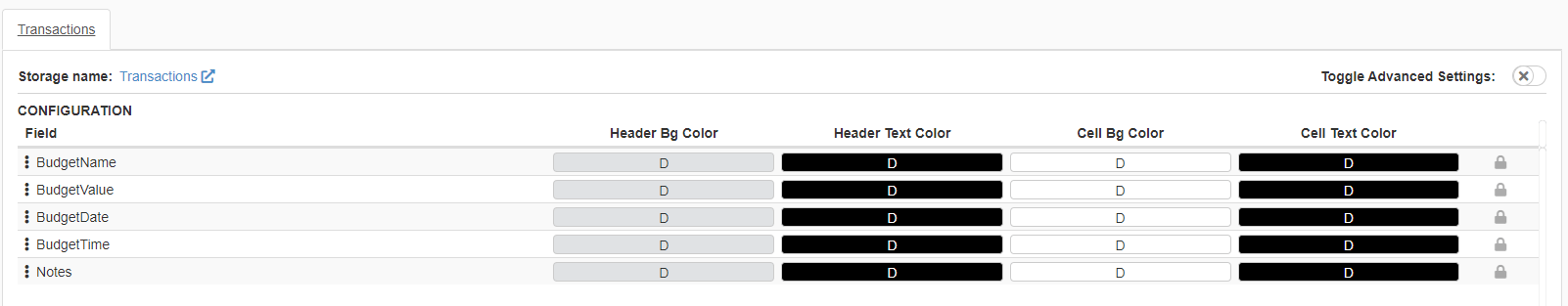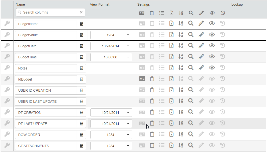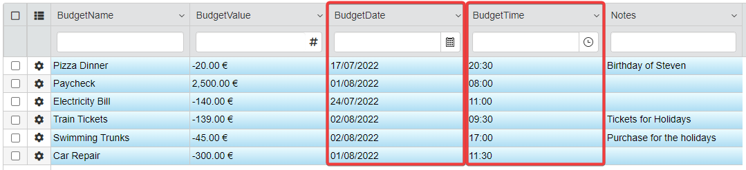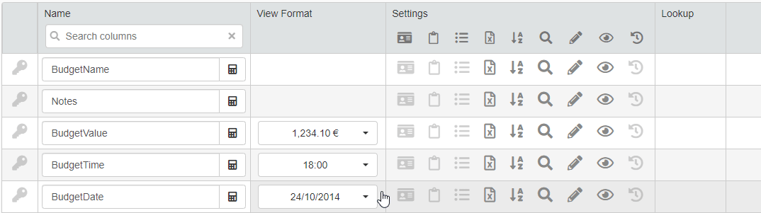 The columns of the table display just the data as they're recorded on the Storage. For example, in BudgetValue you can insert just a number without any other symbol.
