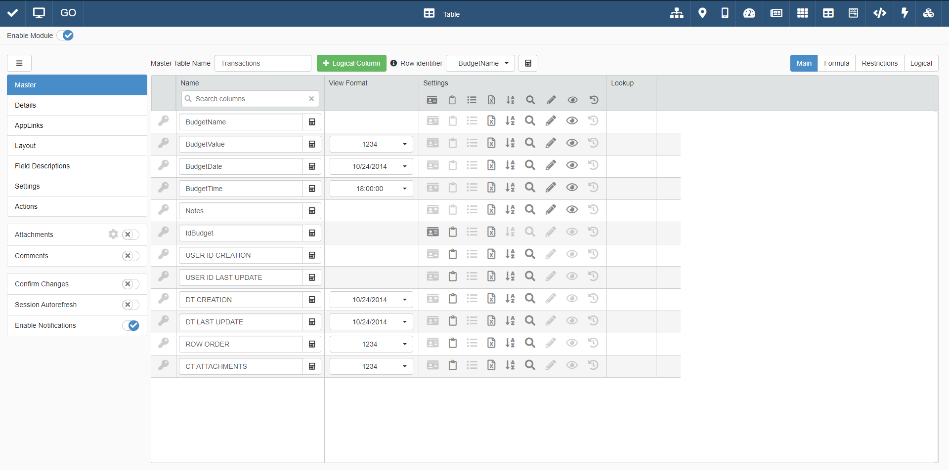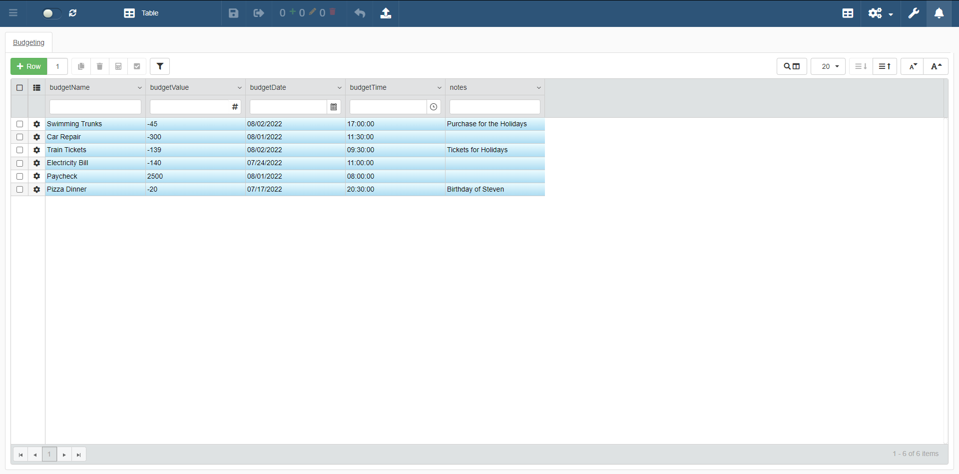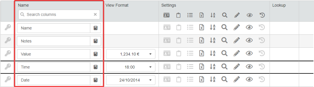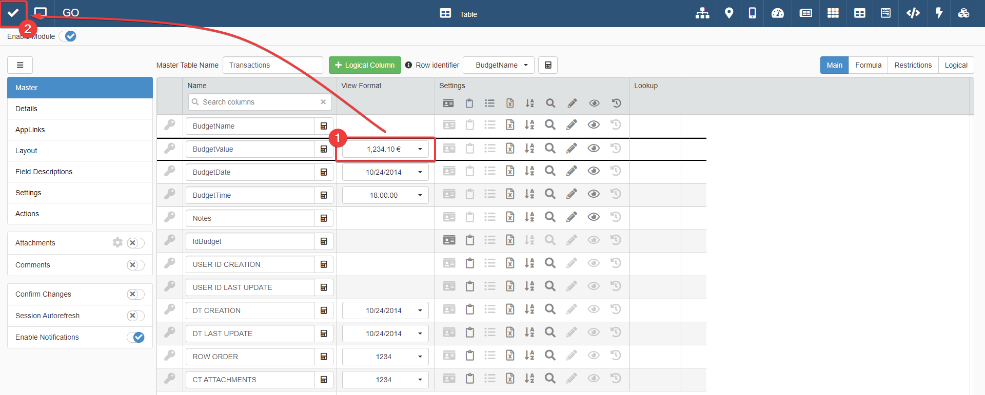 The columns of the table display just the data as they're recorded on the Storage. For example, in BudgetValue you can insert just a number without any other symbol.