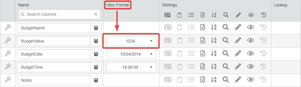Under the View Format column, click on the drop-down list for the BudgetValue field.