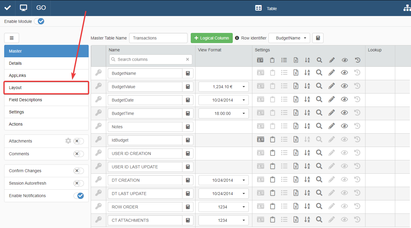 You will land on the Layout sub-panel of Design Mode. Here you can arrange as you wish the table's columns.