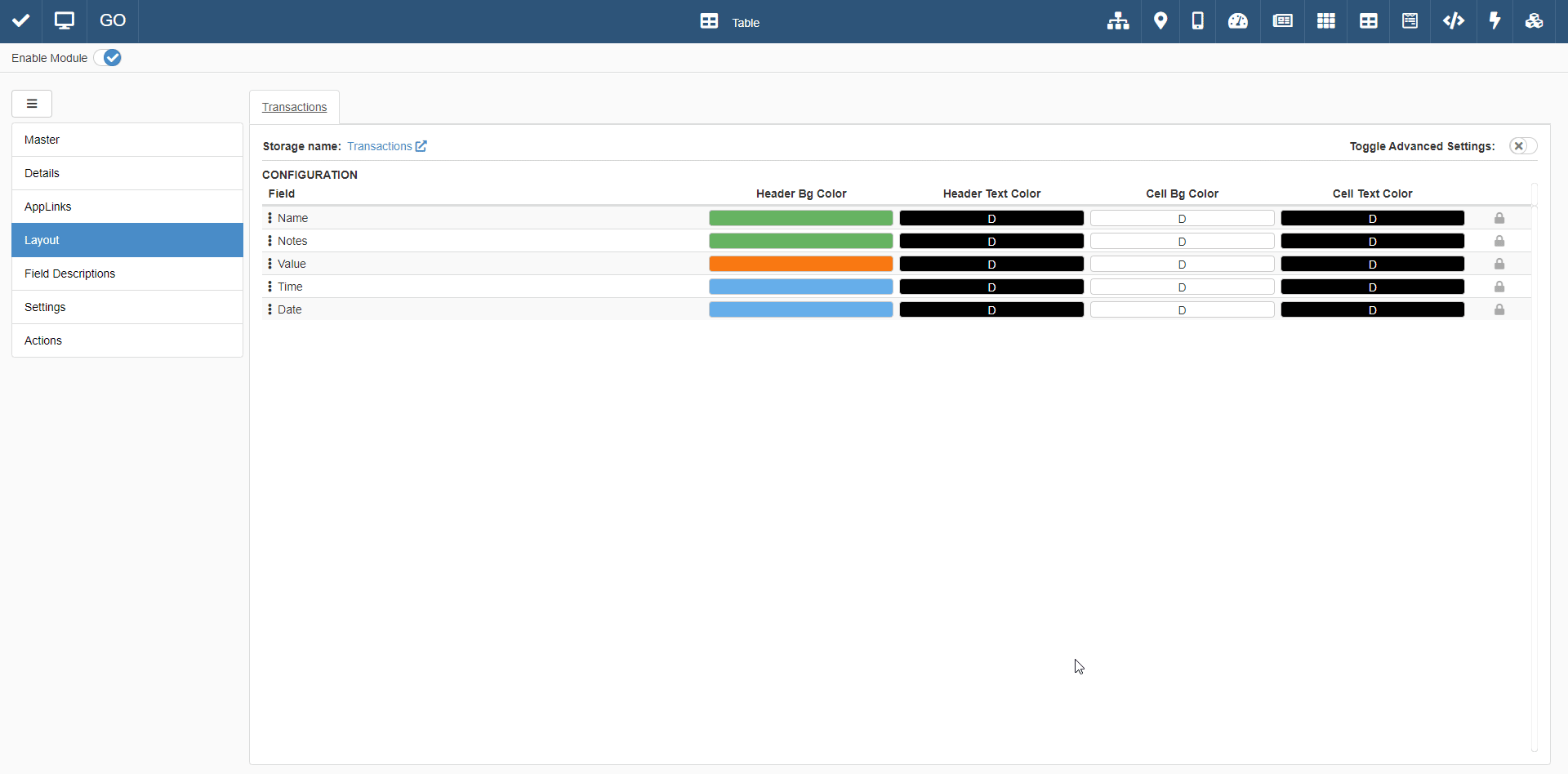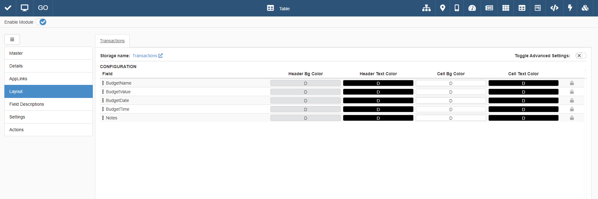 You can customize the table header colors from the Layout sub-panel.