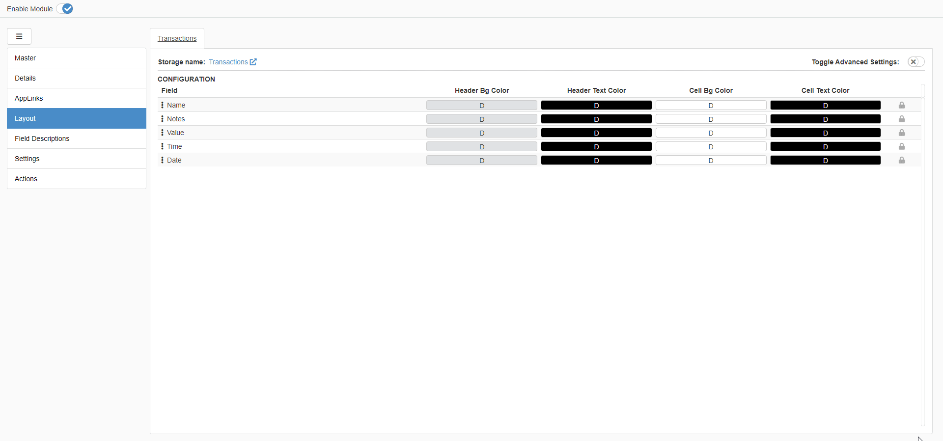 The Layout's Advanced Settings have the following options:
