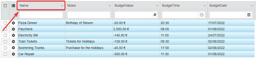 Click on the BudgetName field's textbox under Name column.