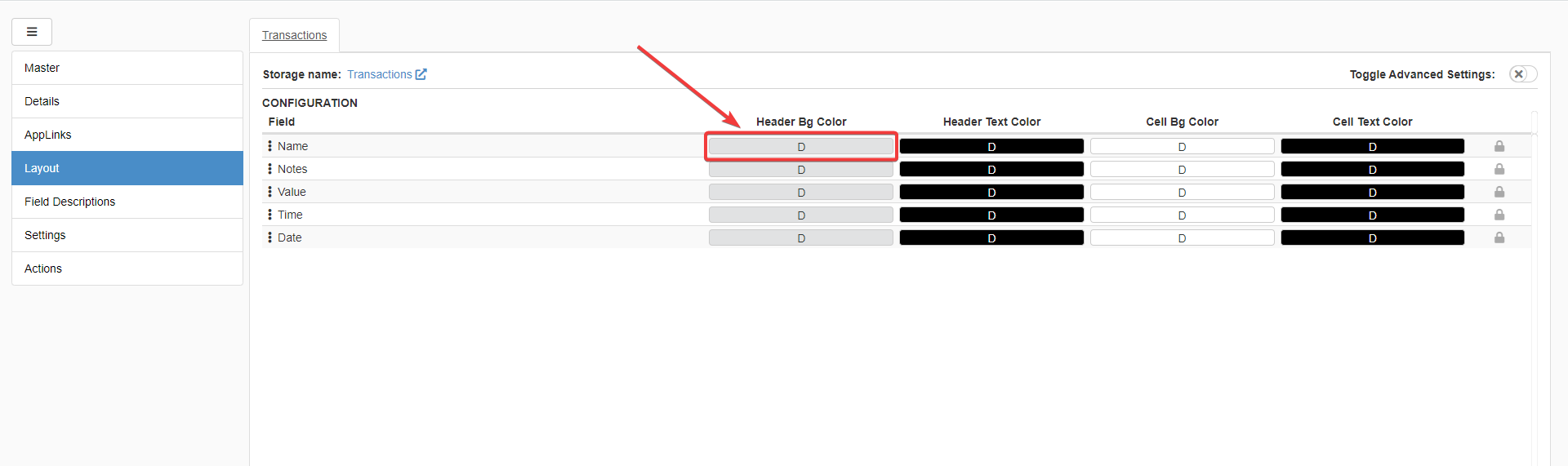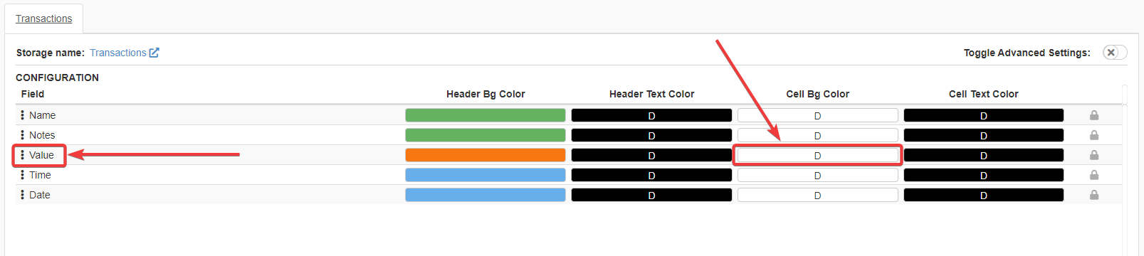In Layout, click on the Cell Bg Color button corresponding to the Value column.