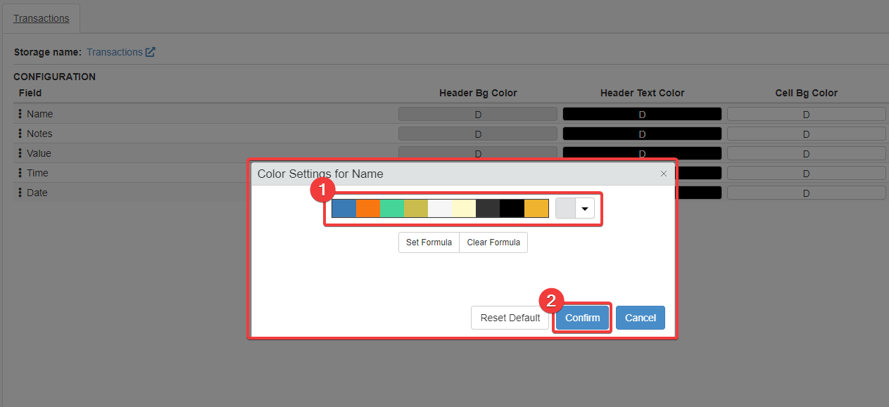 A window that enables to customize the color will appear. (1) Choose the color your prefer from the list or the color palette next to the list. (2) Click on the Confirm button.
