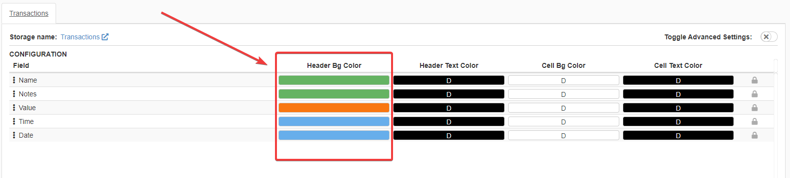 Click on the Header Bg Color button next to the corresponding table header.