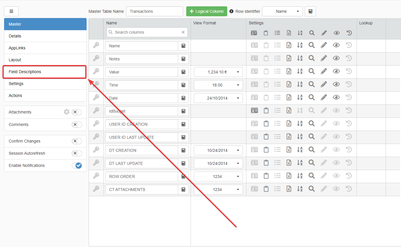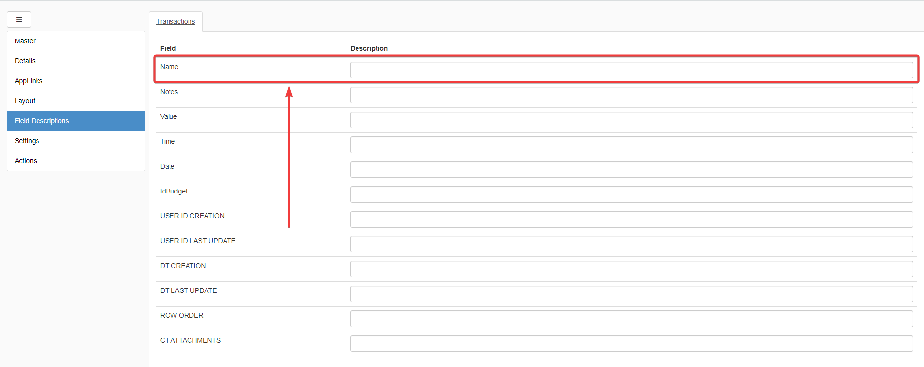 You will access the Field Descriptions sub-panel. Type the fields' descriptions in the textbox corresponding to the field.