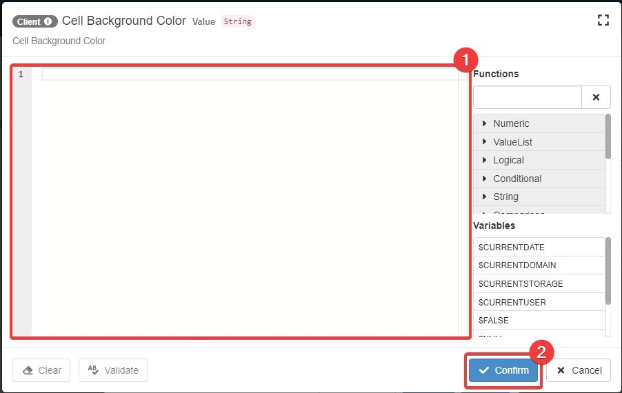 After having copied & pasted the formula in the editor, click on the Confirm button.