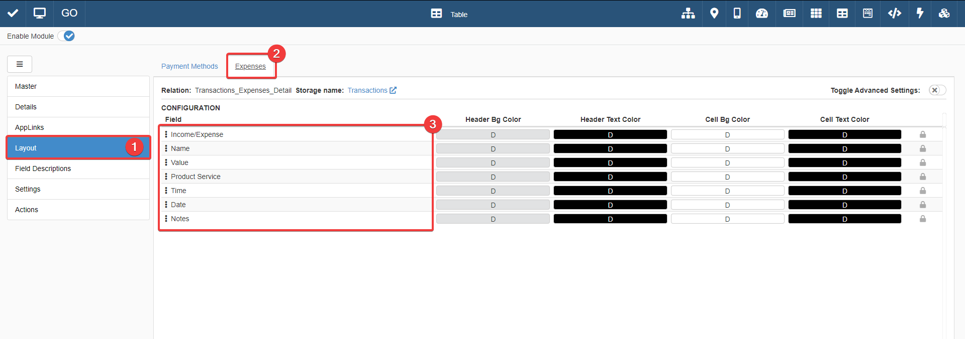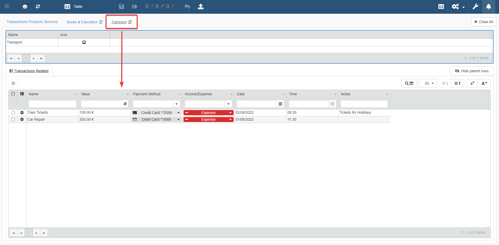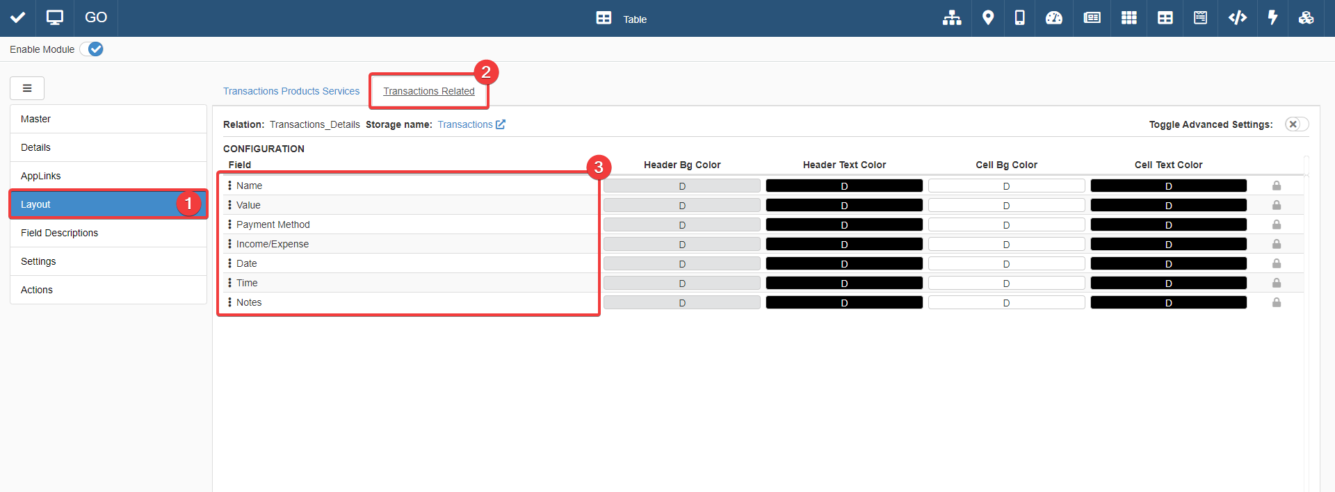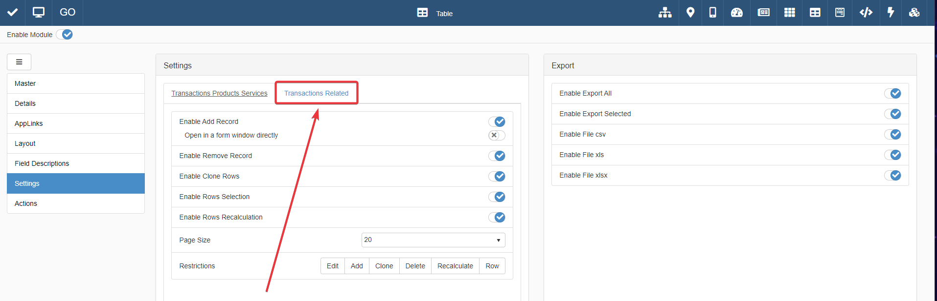 You will access the Settings of the tables. Click on the Transactions Related tab.