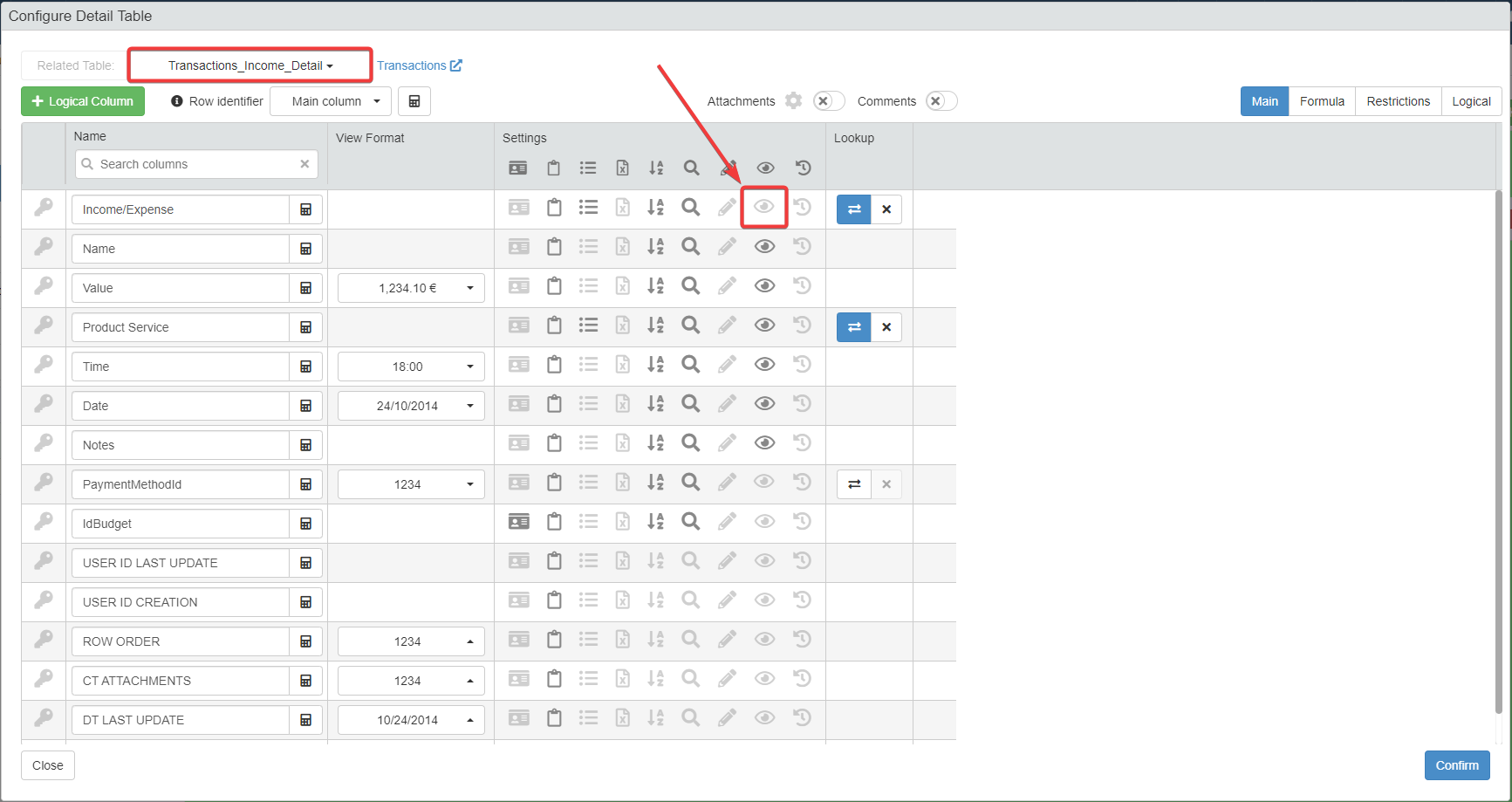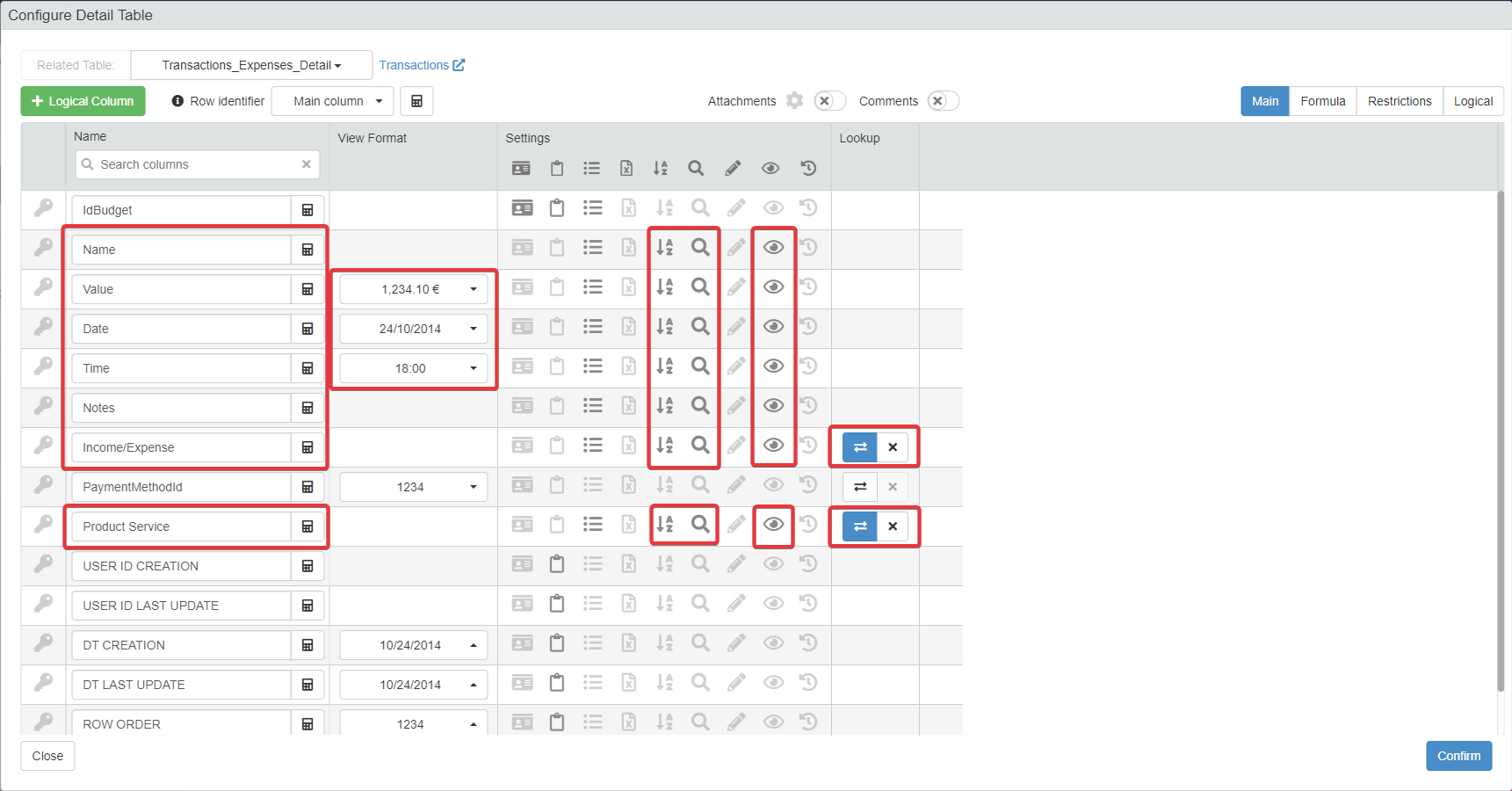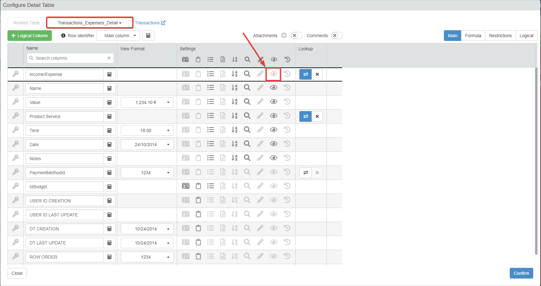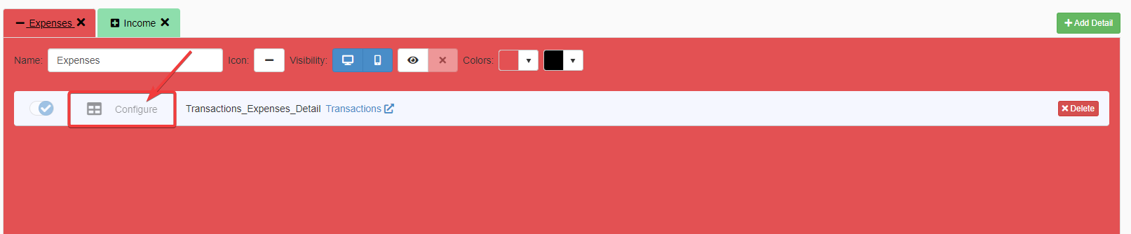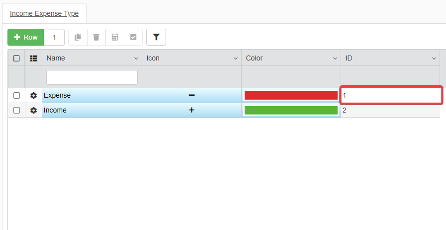 The Formula specifies to pick up only the entries with the field1=EQ($CURRENTSTORAGE.IncomeExpensesTypeId; 1)IncomeExpensesTypeIdequal to 1. 1 is the ID visible for the entry "Expense" in Income Expense Type. This is why you made visible the ID column in Income Expense Type: you must know the exact ID of the option.At this point, the Expenses Detail will display only the entries of transactions classified as