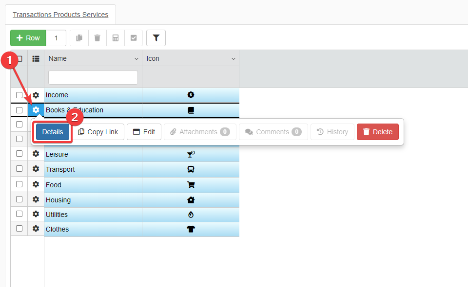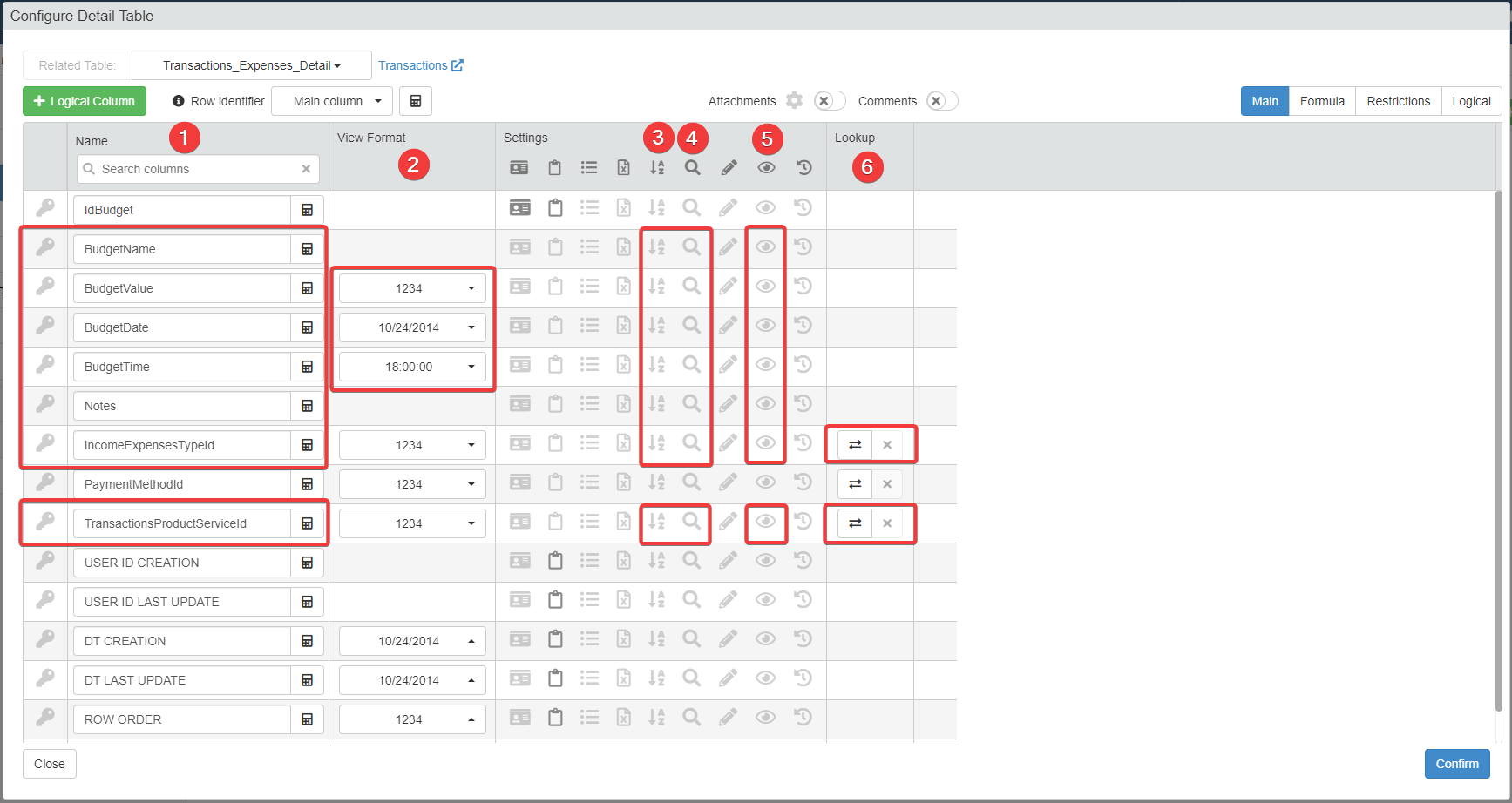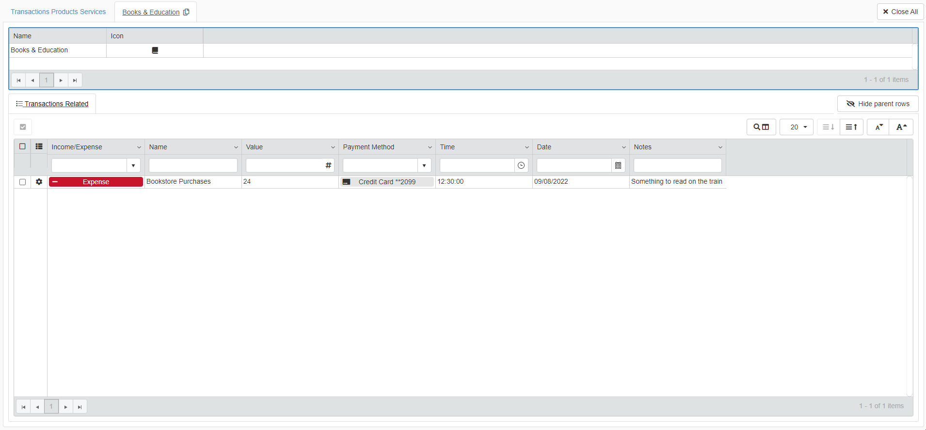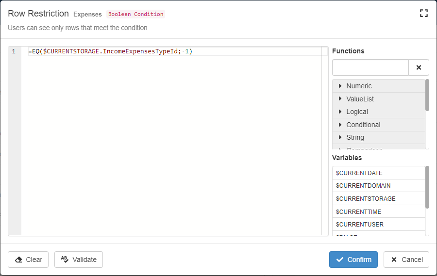 The Formula specifies to pick up only the entries with the field1=EQ($CURRENTSTORAGE.IncomeExpensesTypeId; 1)IncomeExpensesTypeIdequal to 1. 1 is the ID visible for the entry "Expense" in Income Expense Type. This is why you made visible the ID column in Income Expense Type: you must know the exact ID of the option.At this point, the Expenses Detail will display only the entries of transactions classified as