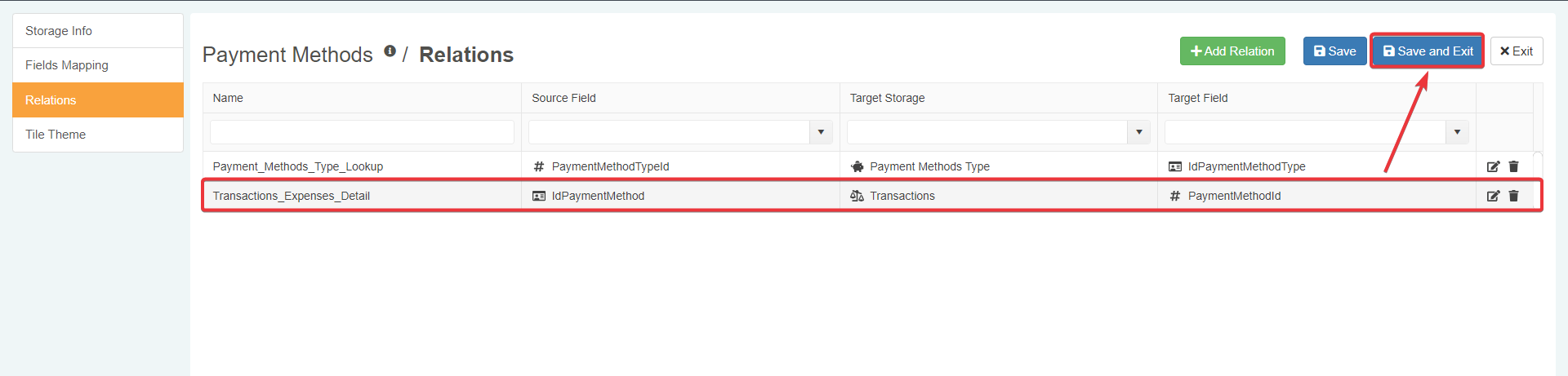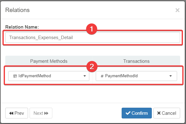 IdPaymentMethodin Payment Methods and thePaymentMethodIdfield in Transactions. Name the RelationTransactions_Expenses_Detail. -