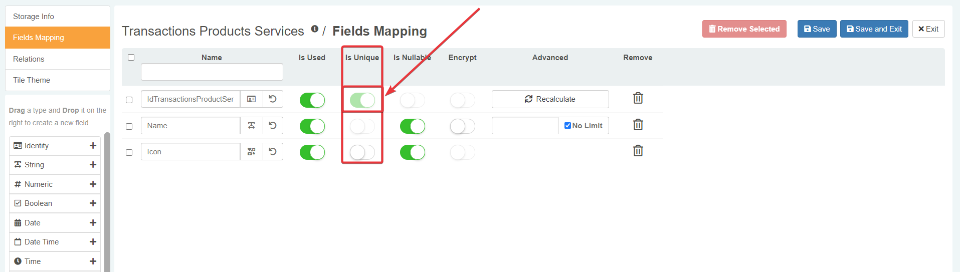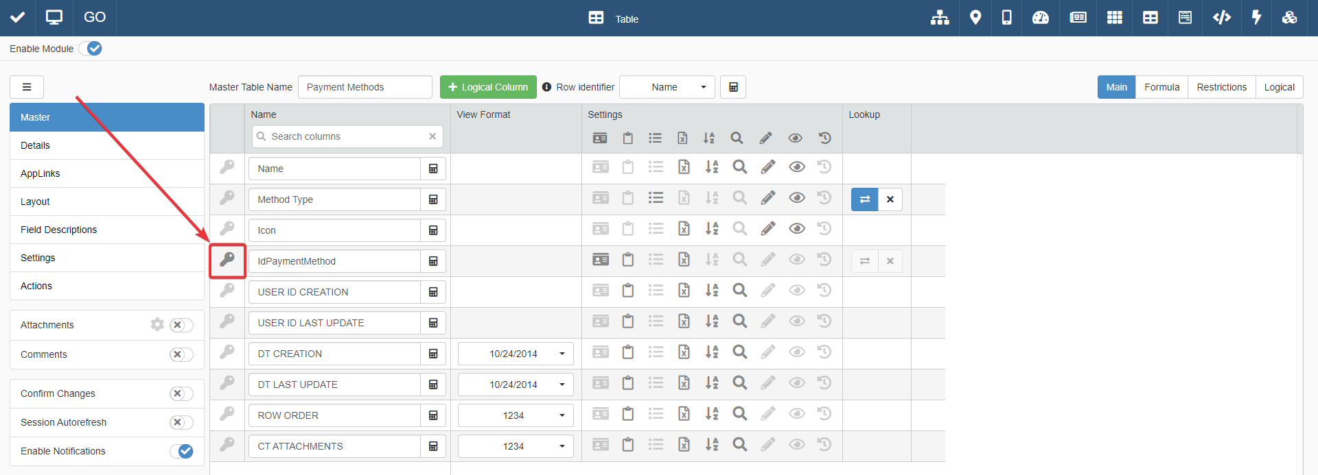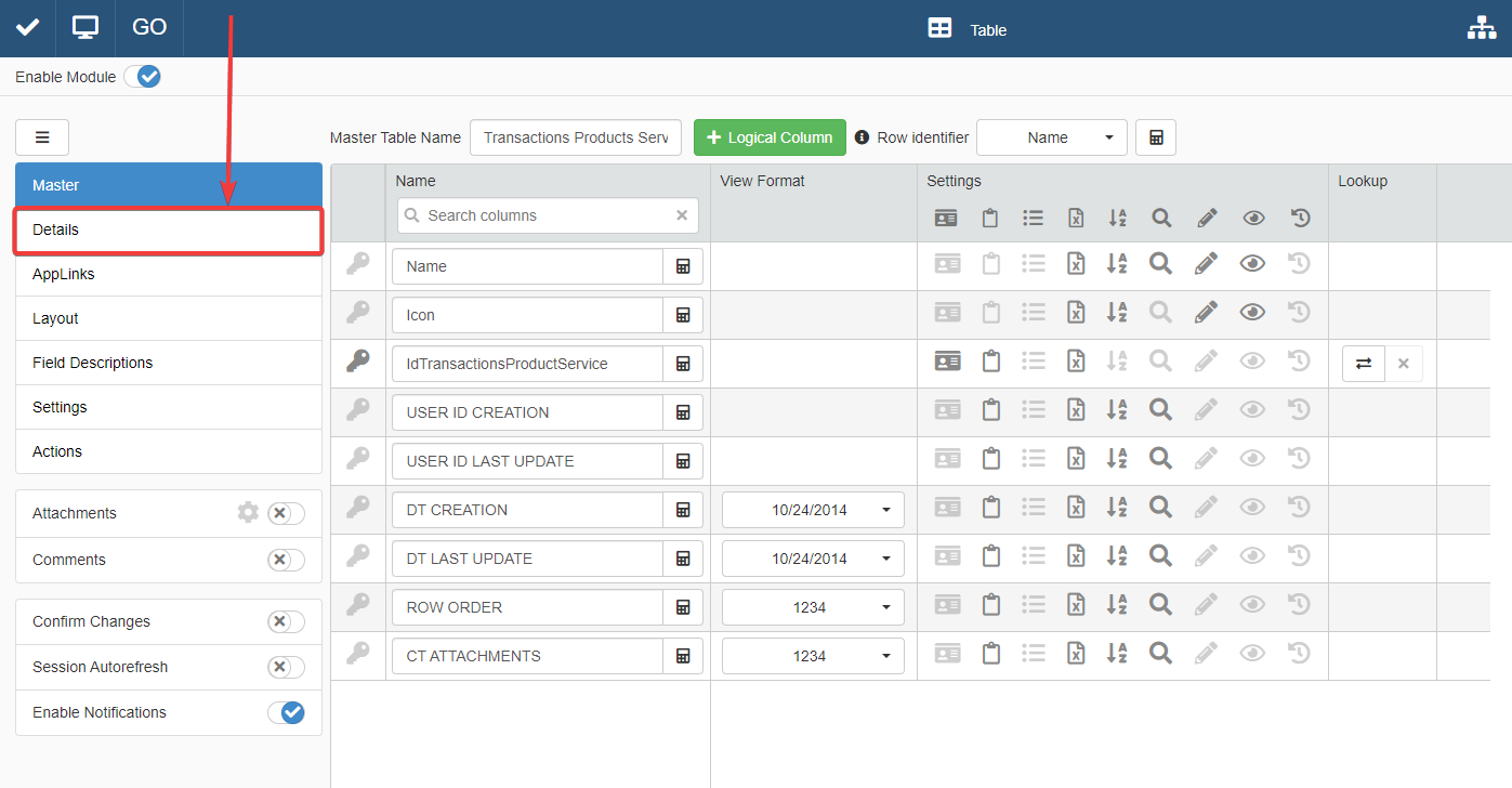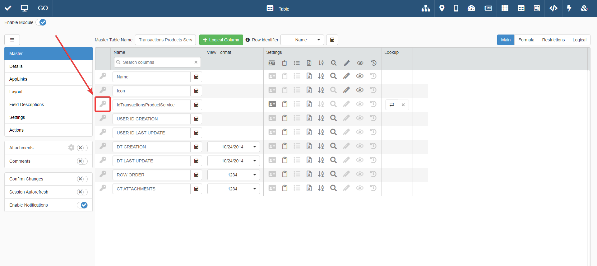 IdTransactionsProductServiceas Primary Key by clicking the Is Primary Key button () next to the field's textbox.Adding Details requires enabling a Primary Key. The application associates the Detail's entries to each Master's entry by the Primary Key.