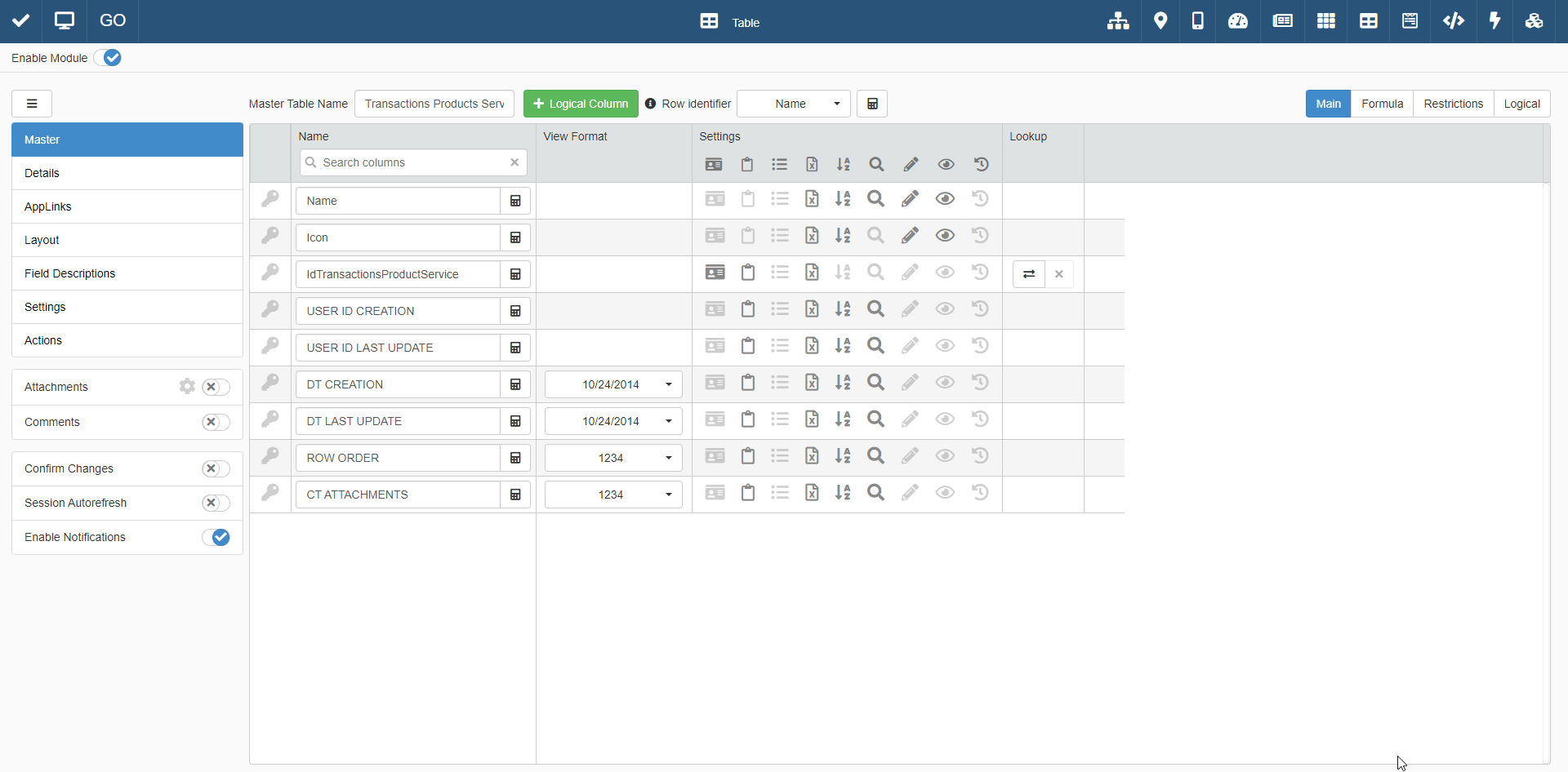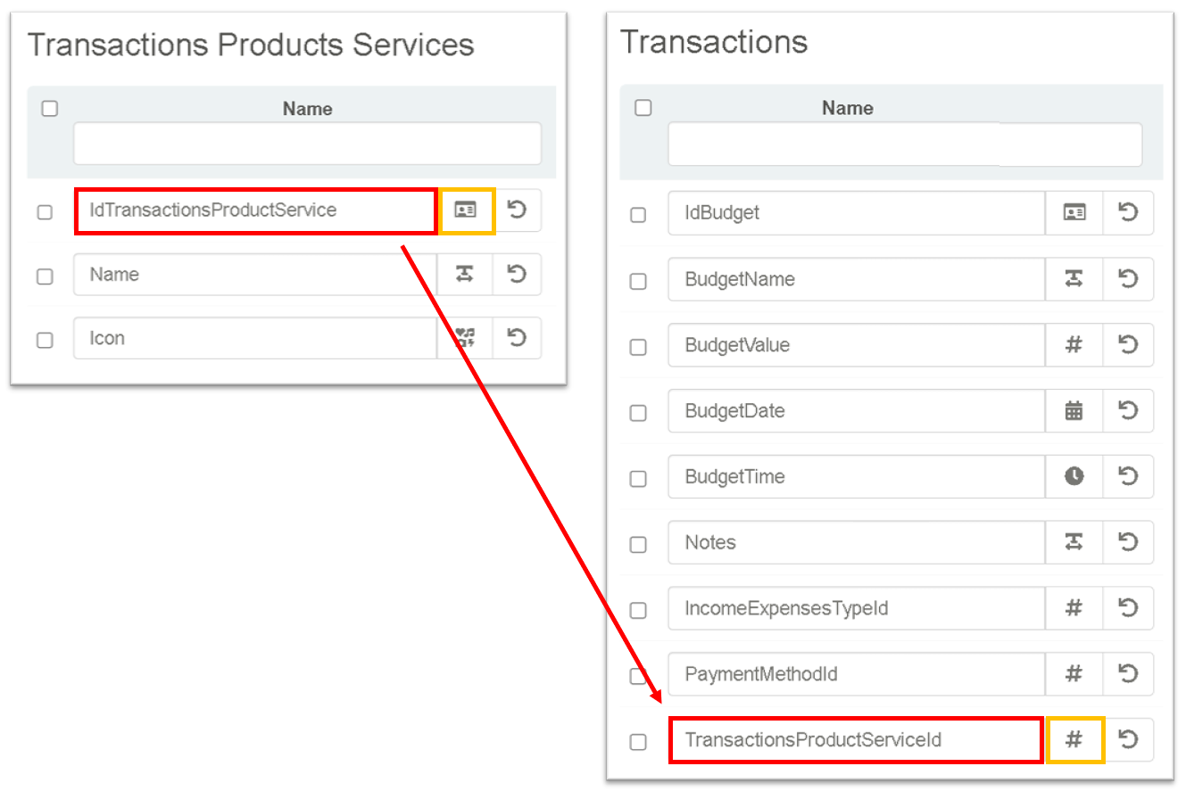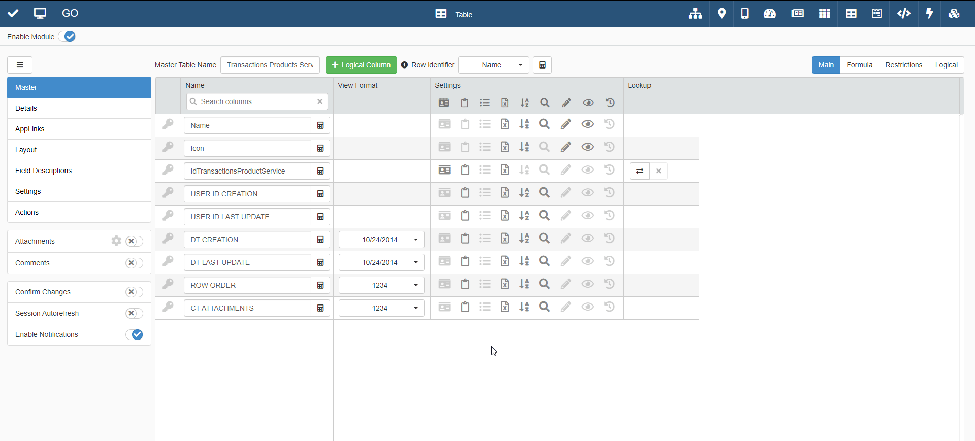 IdTransactionsProductServiceas Primary Key by clicking the Is Primary Key button () next to the field's textbox.Adding Details requires enabling a Primary Key. The application associates the Detail's entries to each Master's entry by the Primary Key.