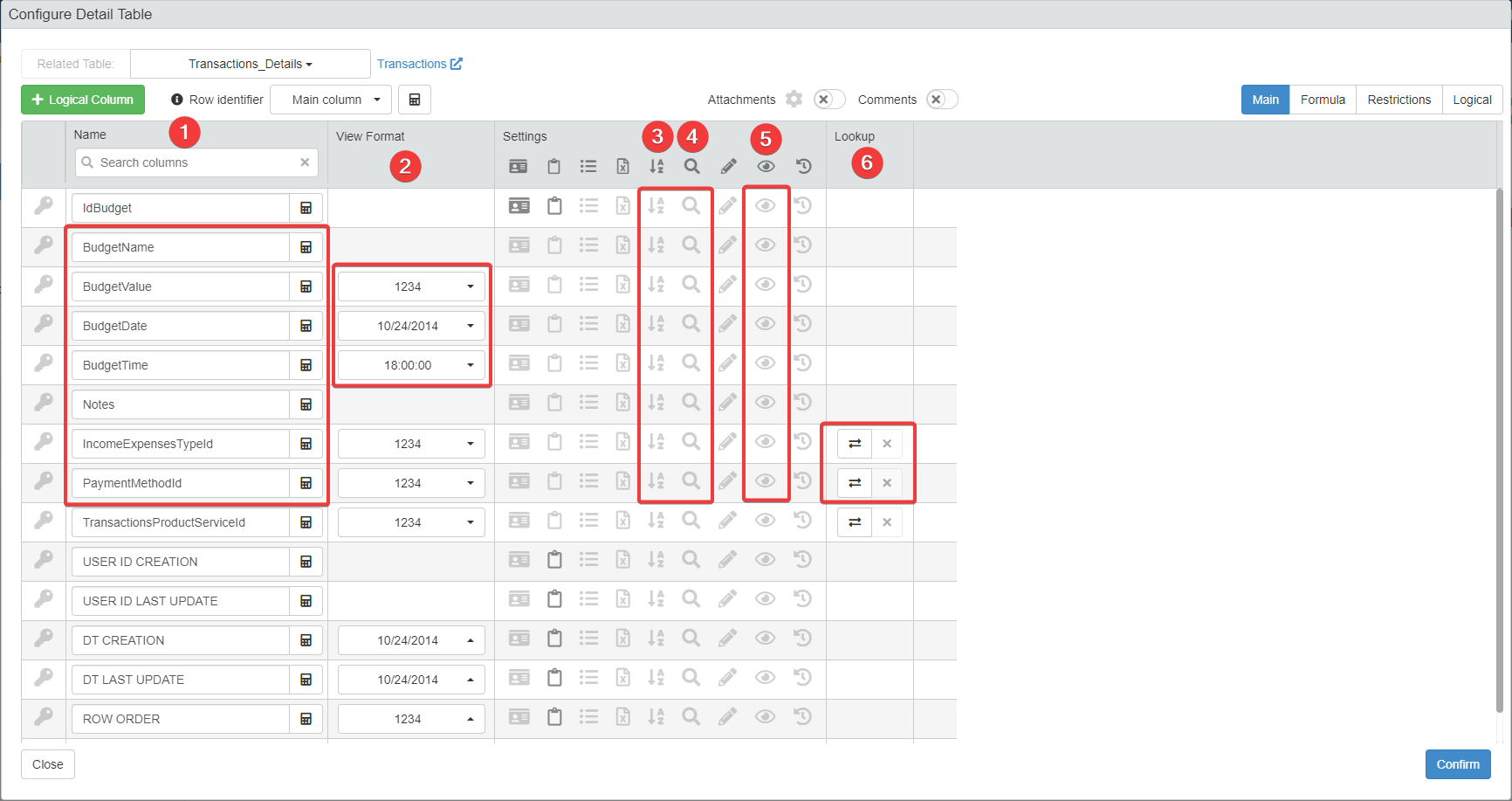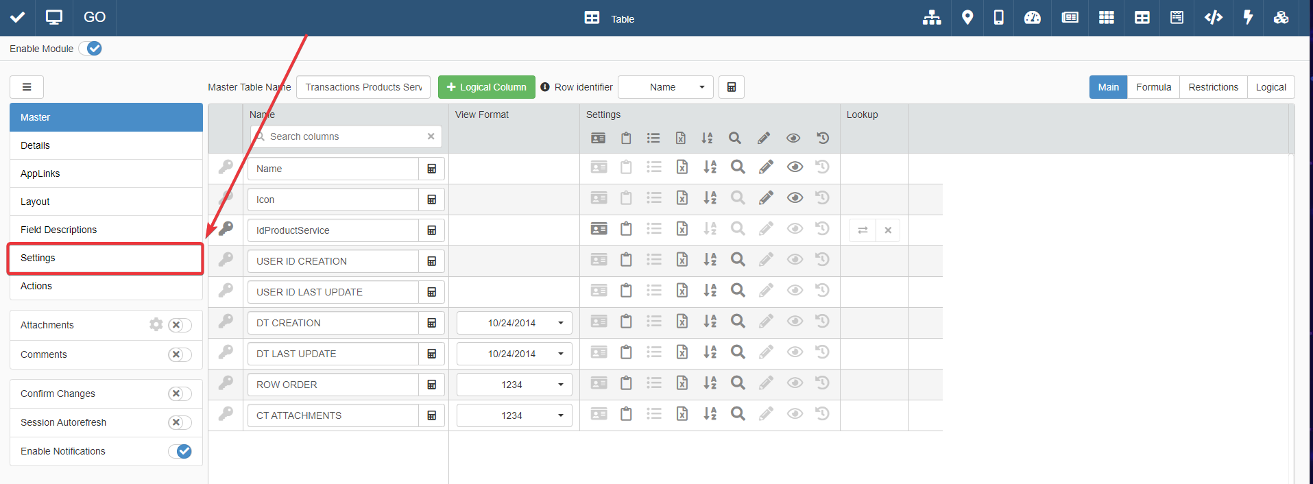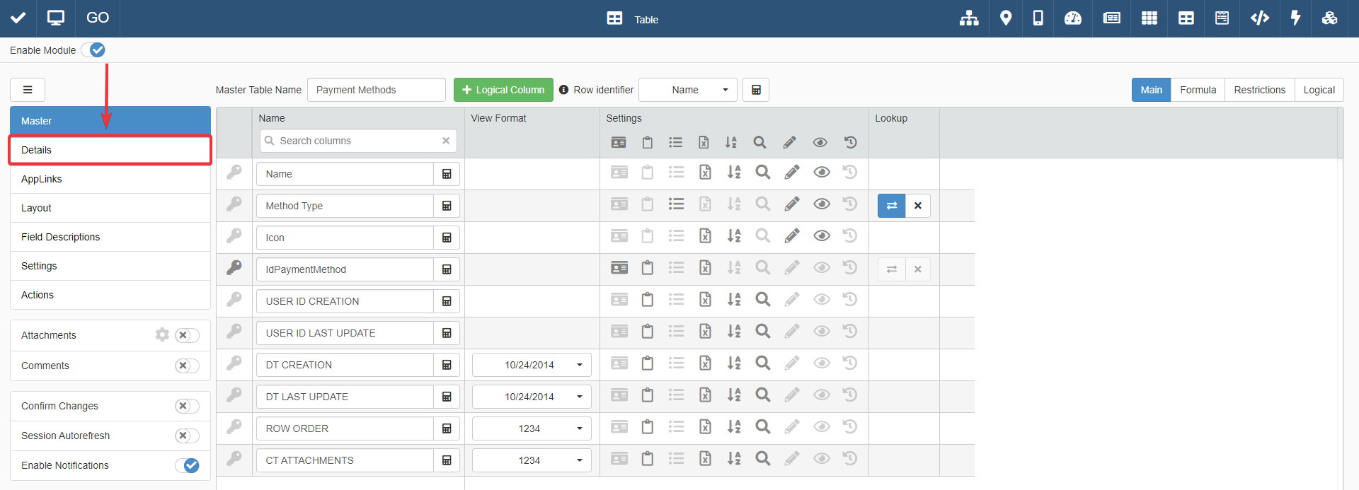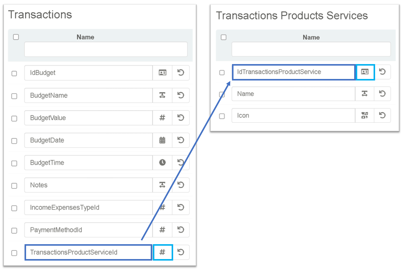 IdTransactionsProductServiceas Primary Key by clicking the Is Primary Key button () next to the field's textbox.Adding Details requires enabling a Primary Key. The application associates the Detail's entries to each Master's entry by the Primary Key.