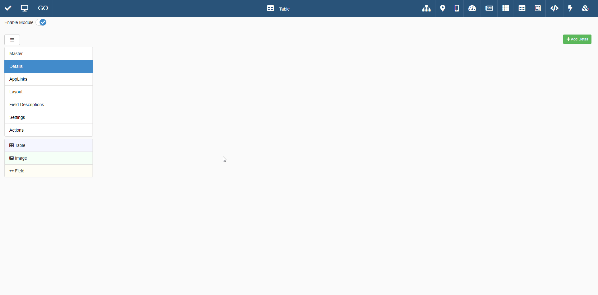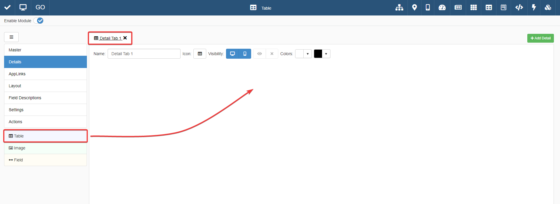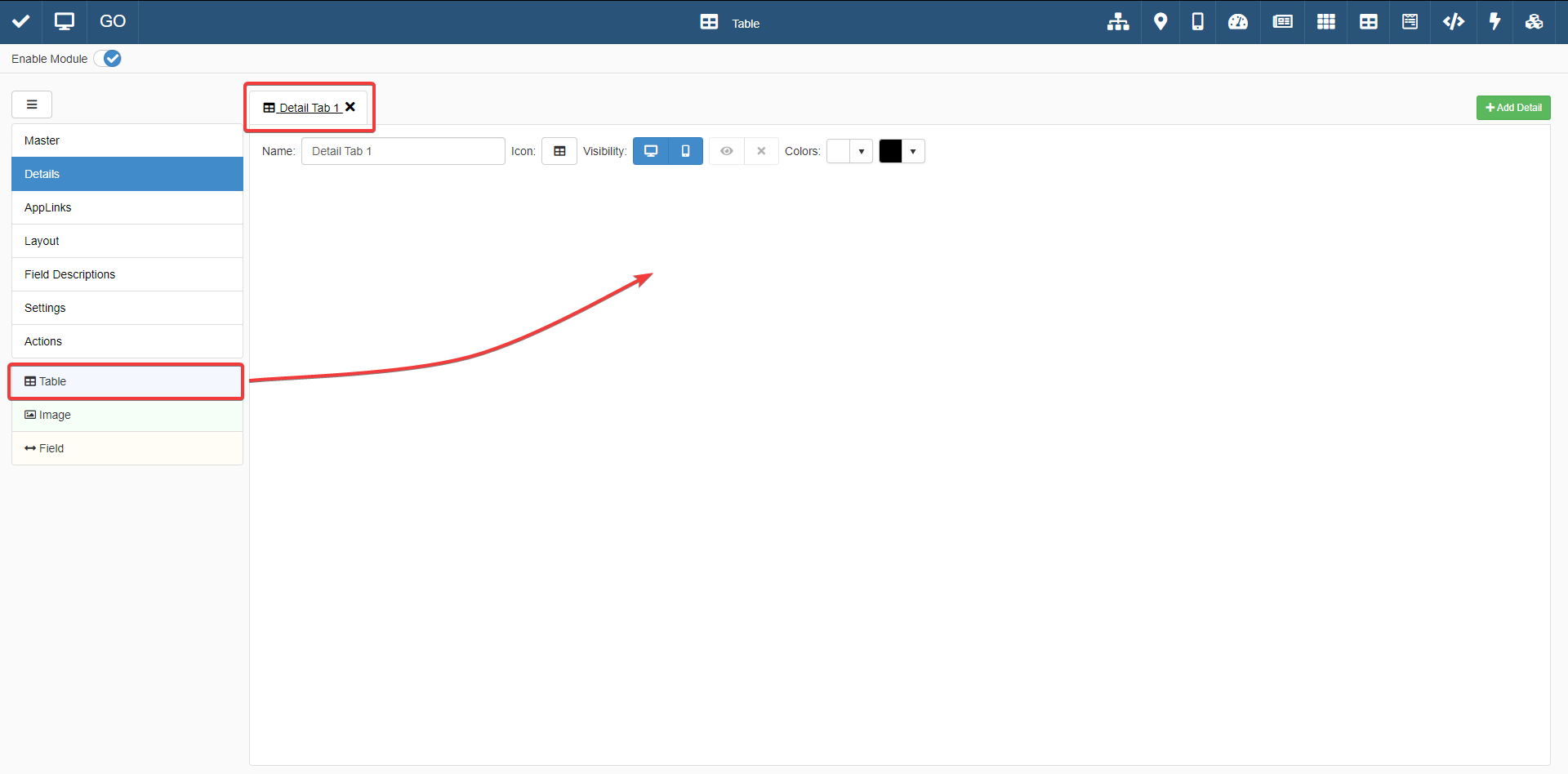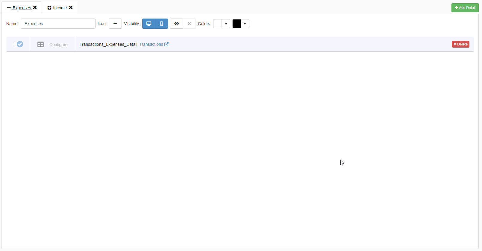 Click on the Add Detail button on the upper right corner of the sub-panel. A new Detail tab will appear in the sub-panel.