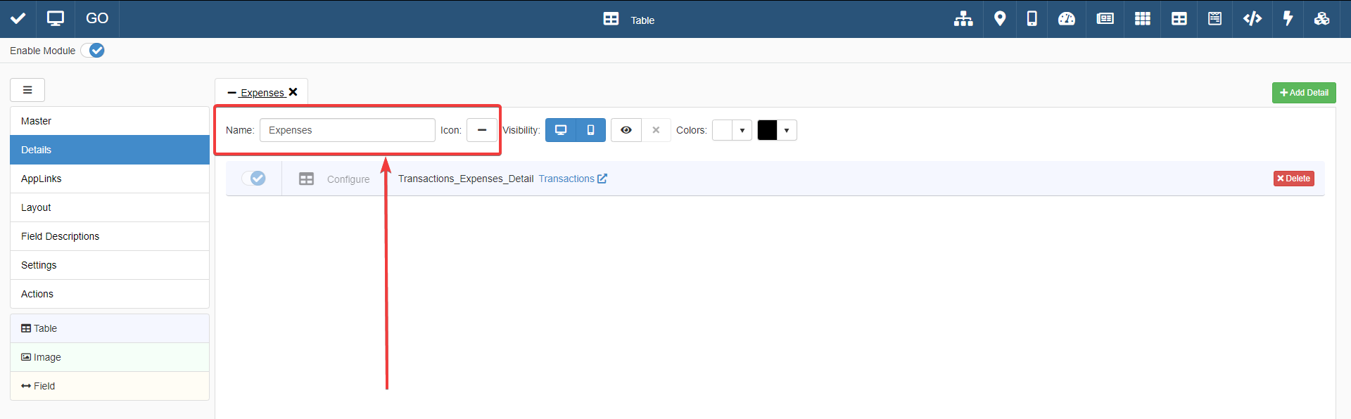 - Type the Detail's name in the textbox. Call the Detail's tab Expenses