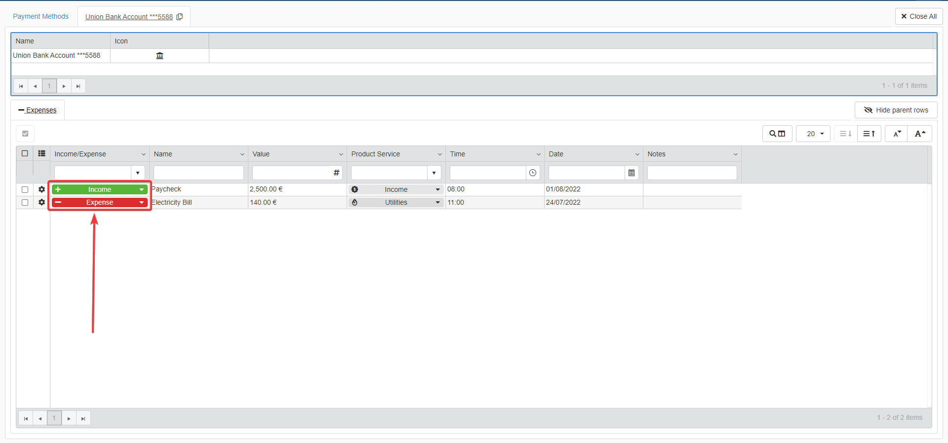Exercise: Divide the Income entries by Payment Method in Payment Methods¶