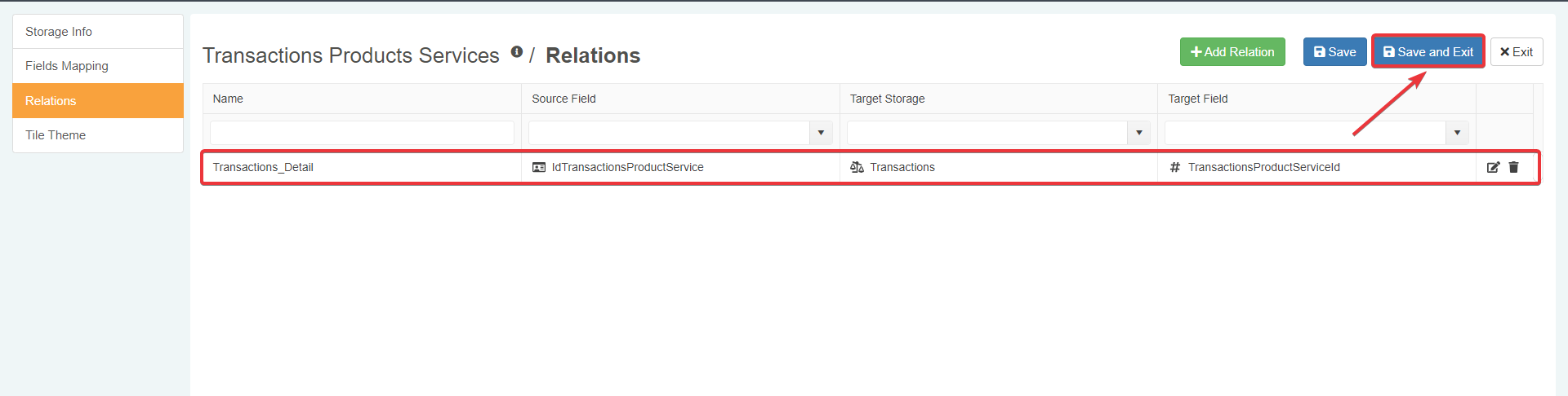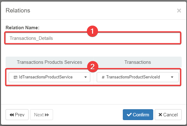 IdTransactionsProductServiceandTransactionsProductServiceIdas target field. Name the relationTransactions_Details. The relation from an Identity field to a Numeric field is correct. You will discover in Relations and Details why in this case you invert Numeric and Identity fields in the relation. -