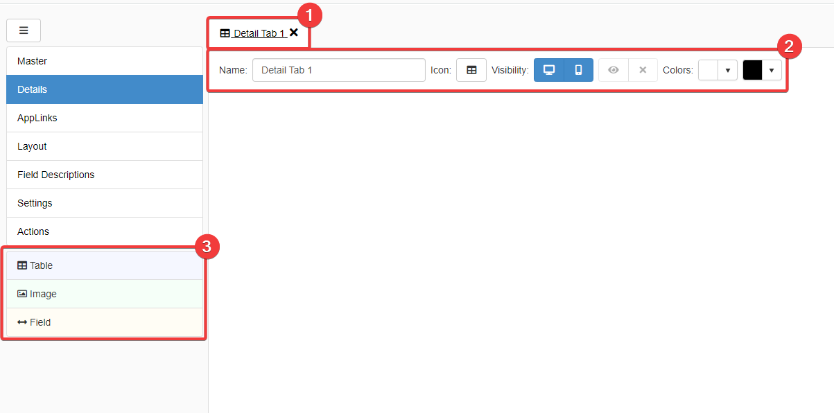 - (2) Settings: You can decide a label for the Detail, choose an icon, desktop and mobile options, visibility restrictions, and colors.