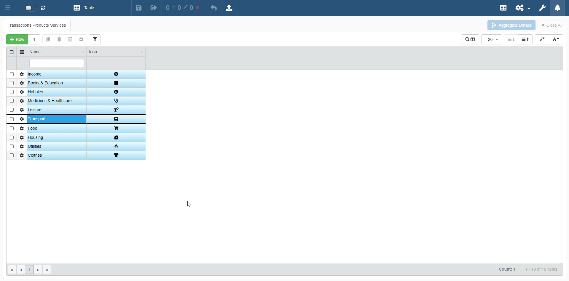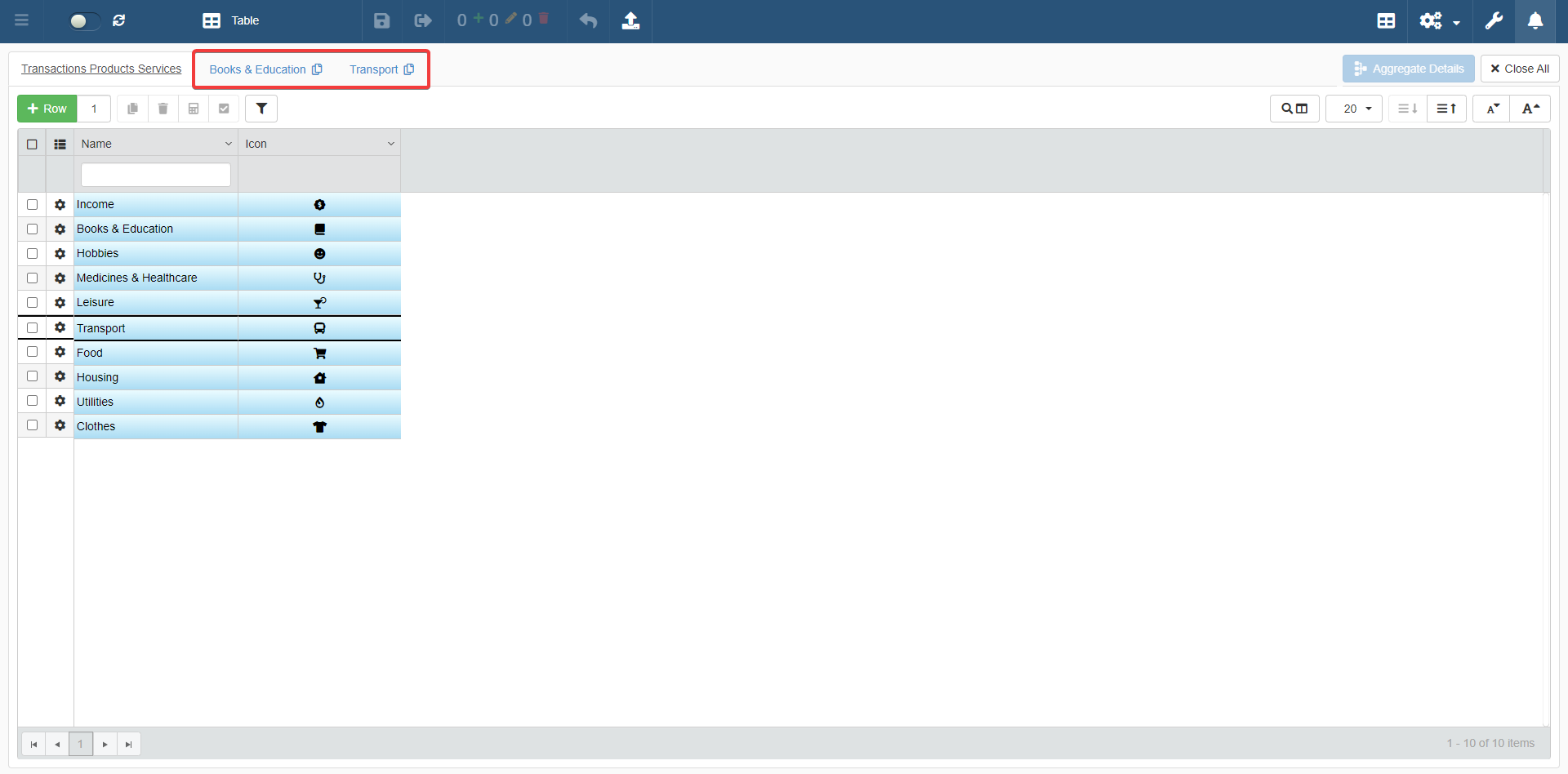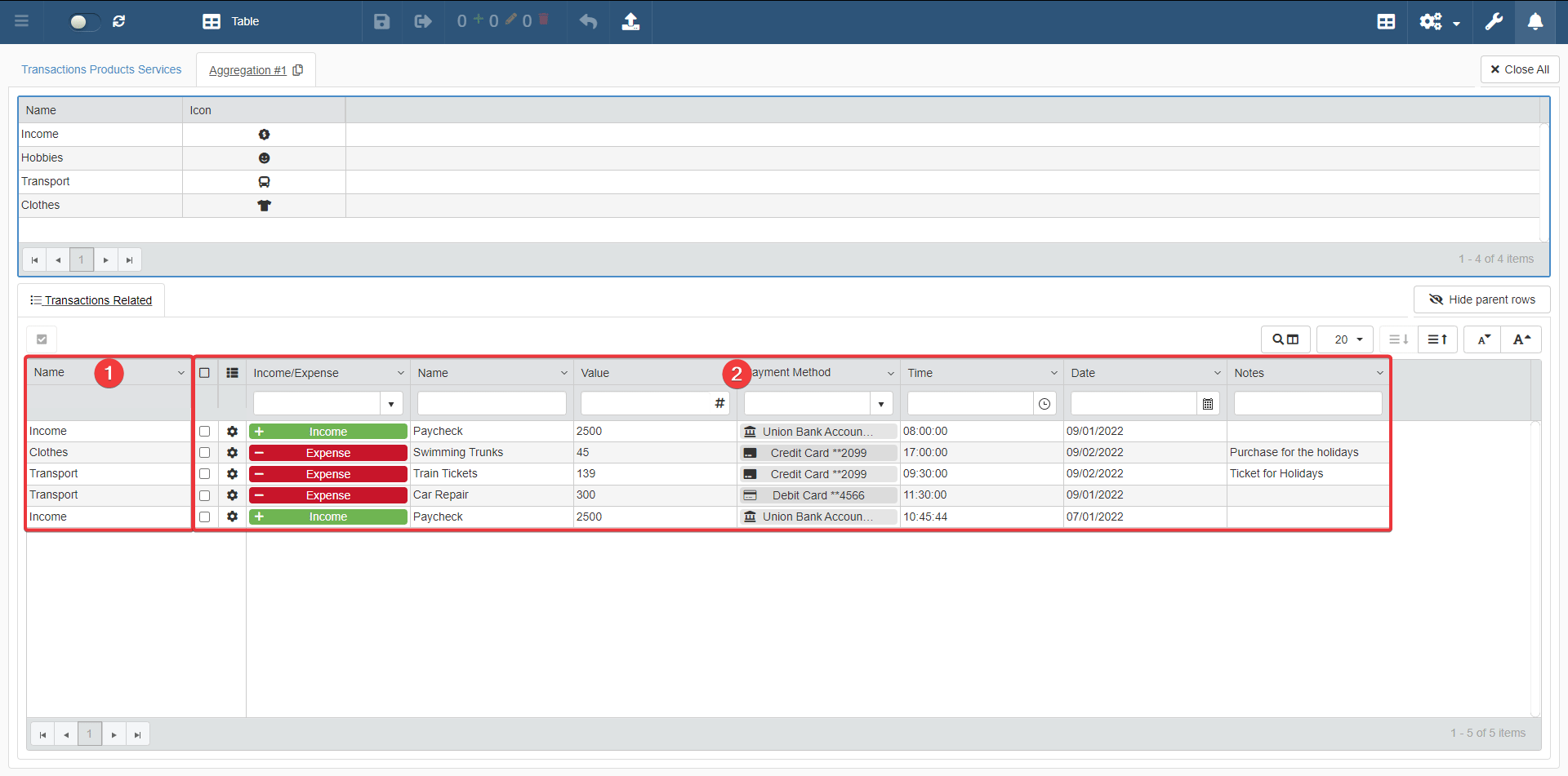 - The column Name (1) on the left specifies to what Master table's row the Detail's row belongs. On the right, there is the standard table containing all the aggregated rows (2).