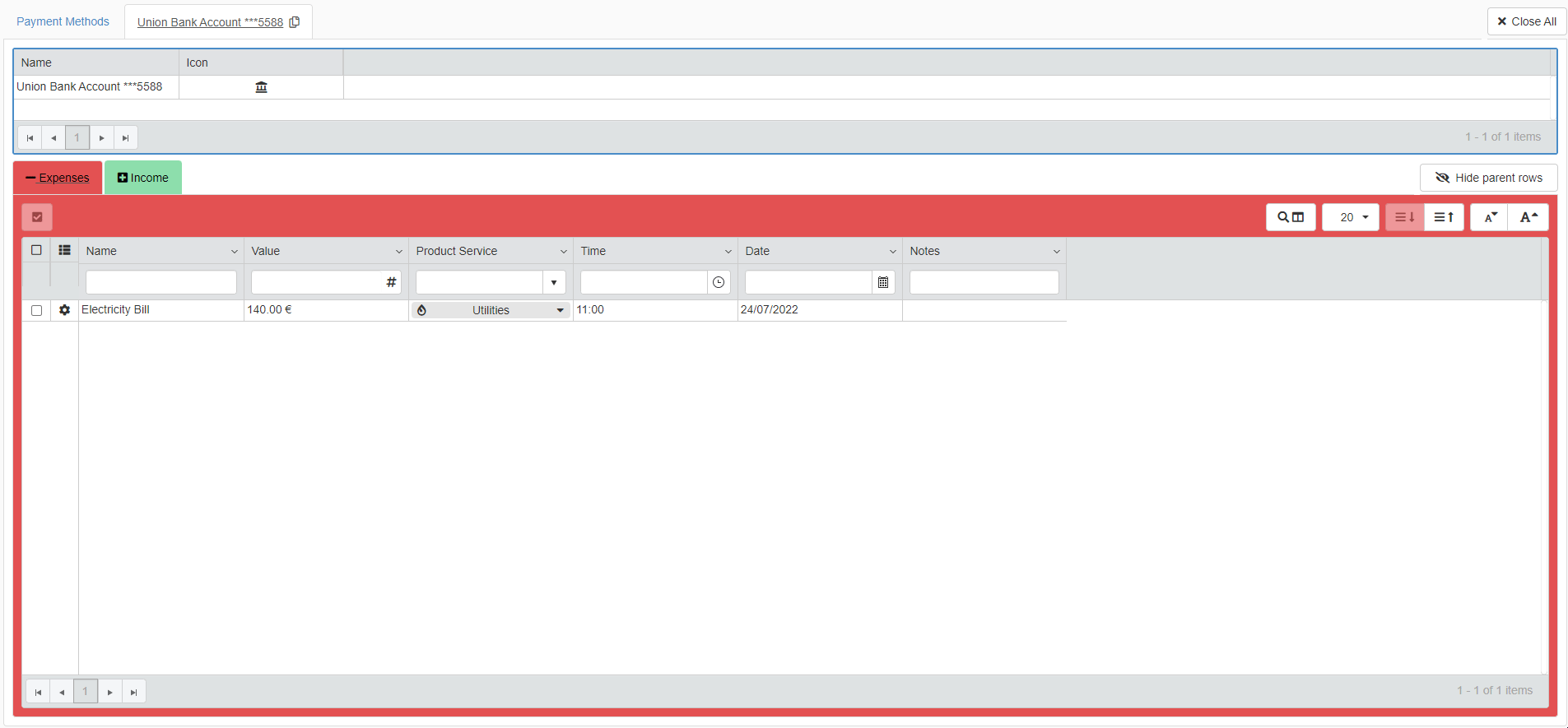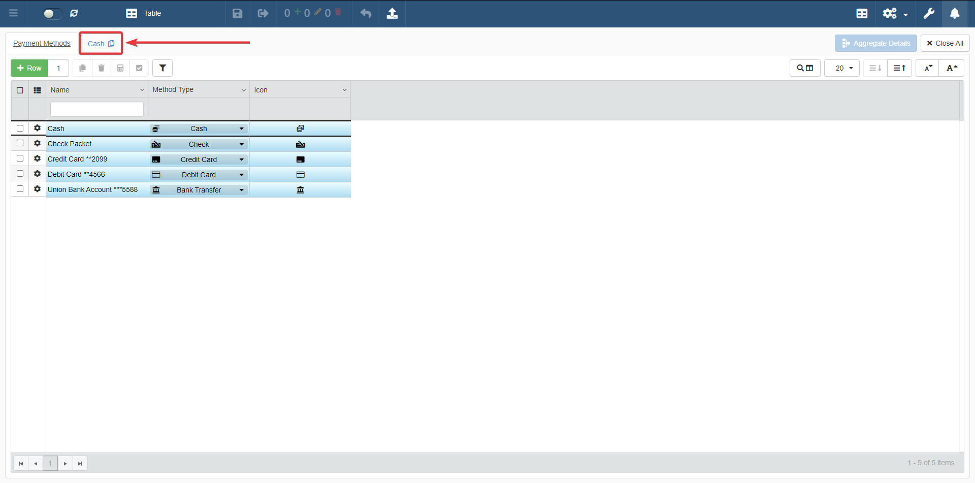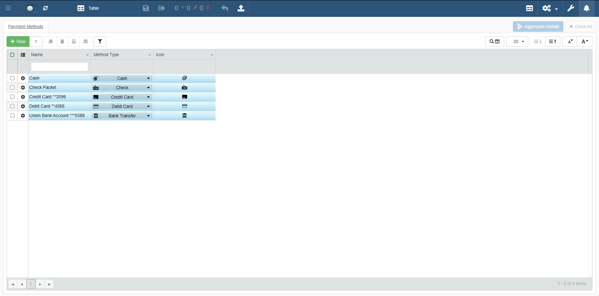 Accessing the application Payment Methods, you will see the colored Detail tabs without the Income/Expense column.