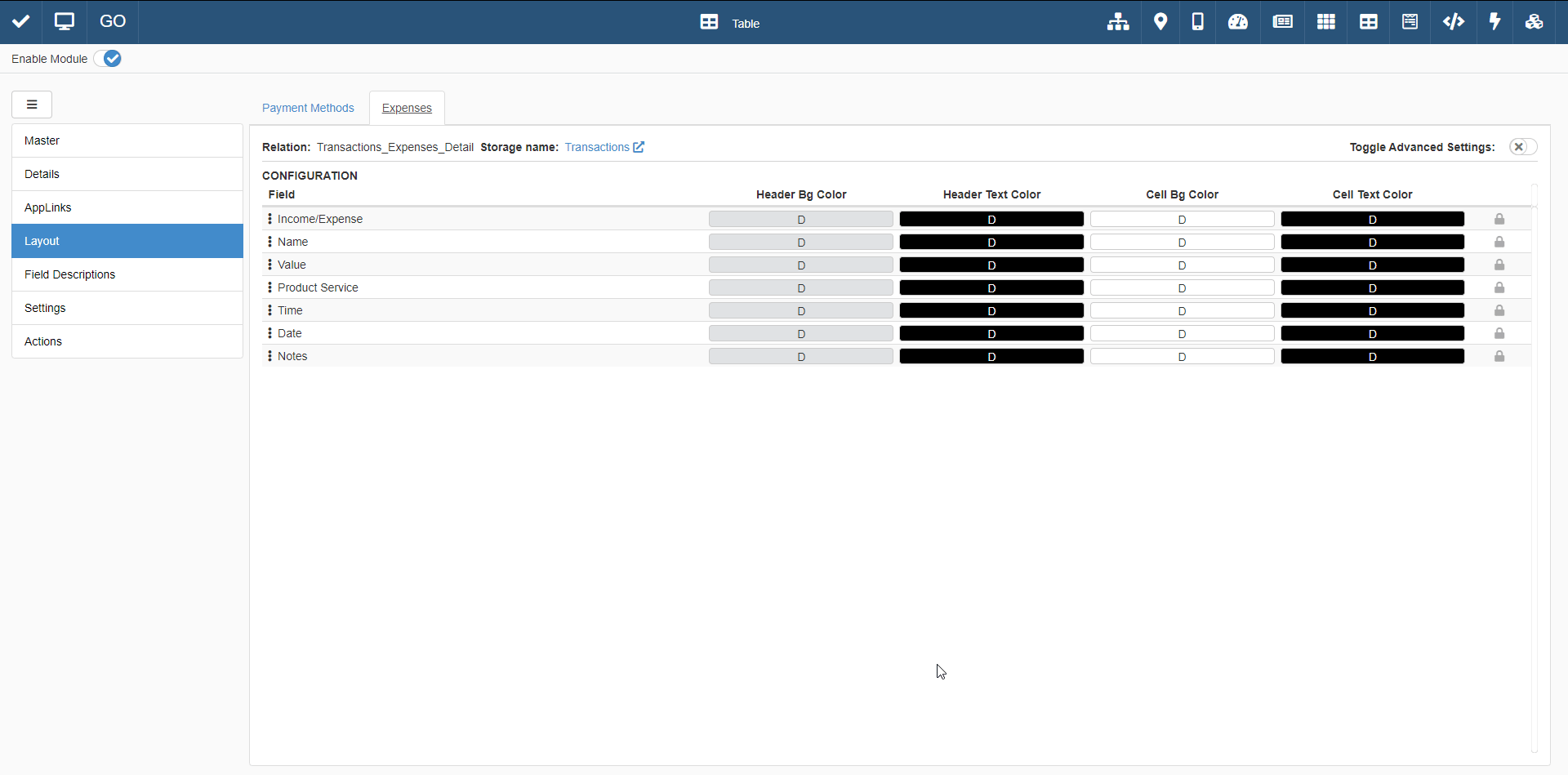 The window will display the fields' settings of the Storage Transactions like the configuration of the Master table.