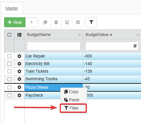 - Click on the icon next to BudgetValue. A drop-down list of filtering options will appear.
