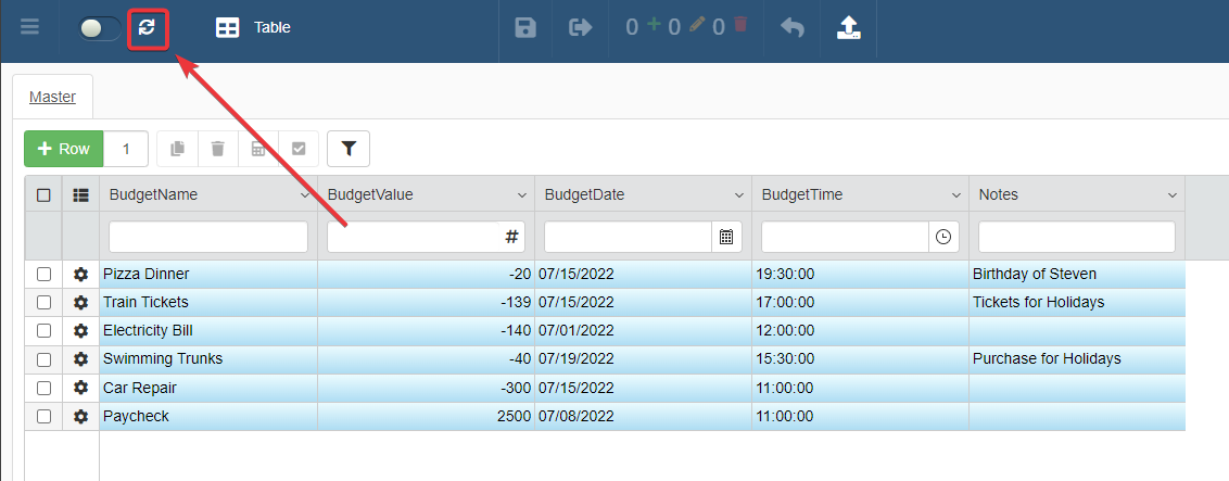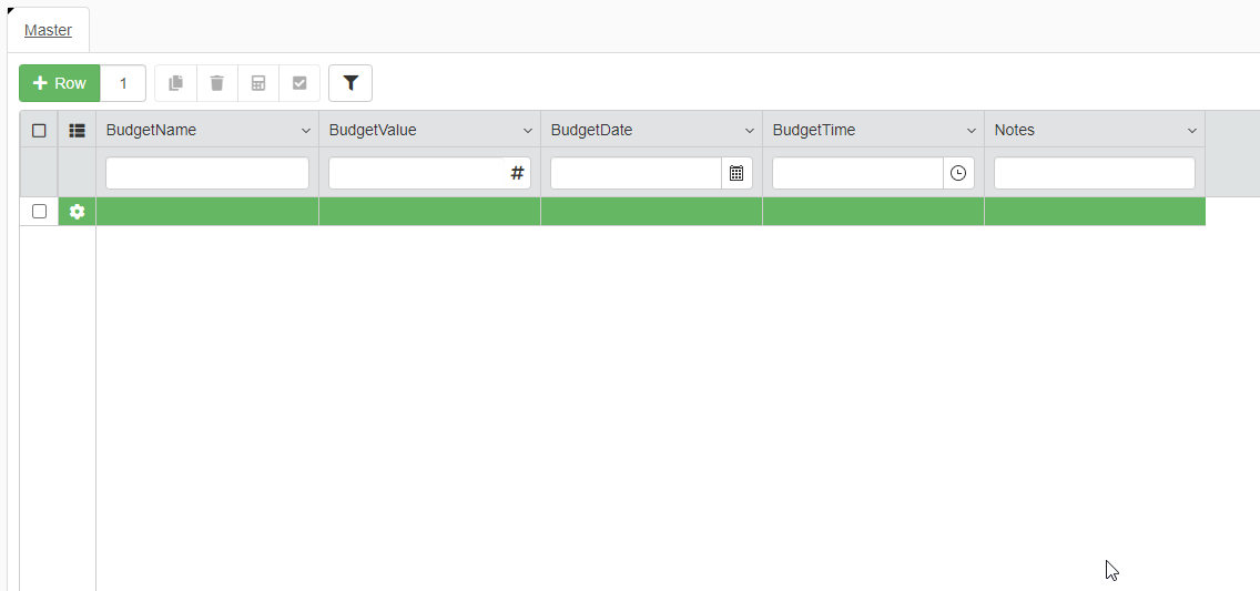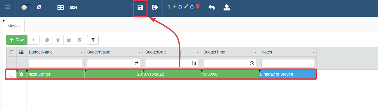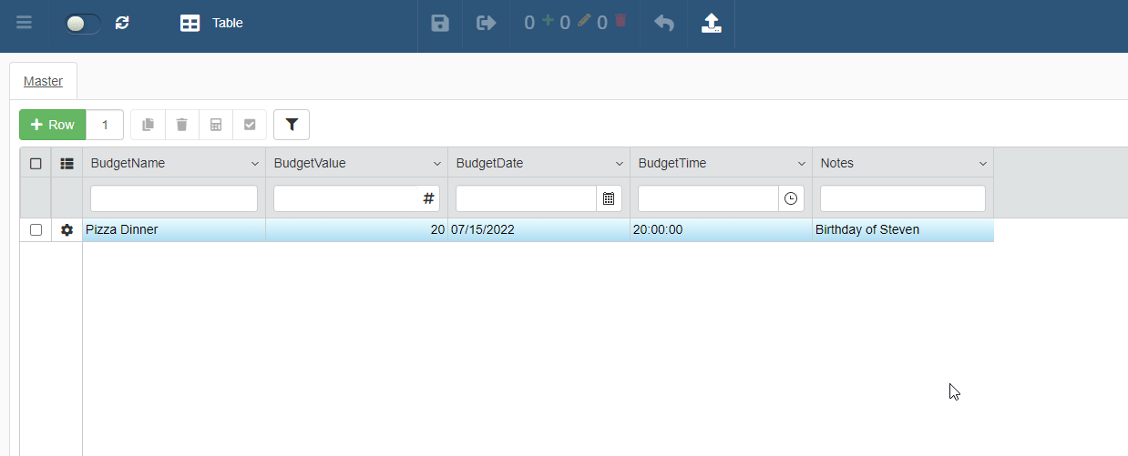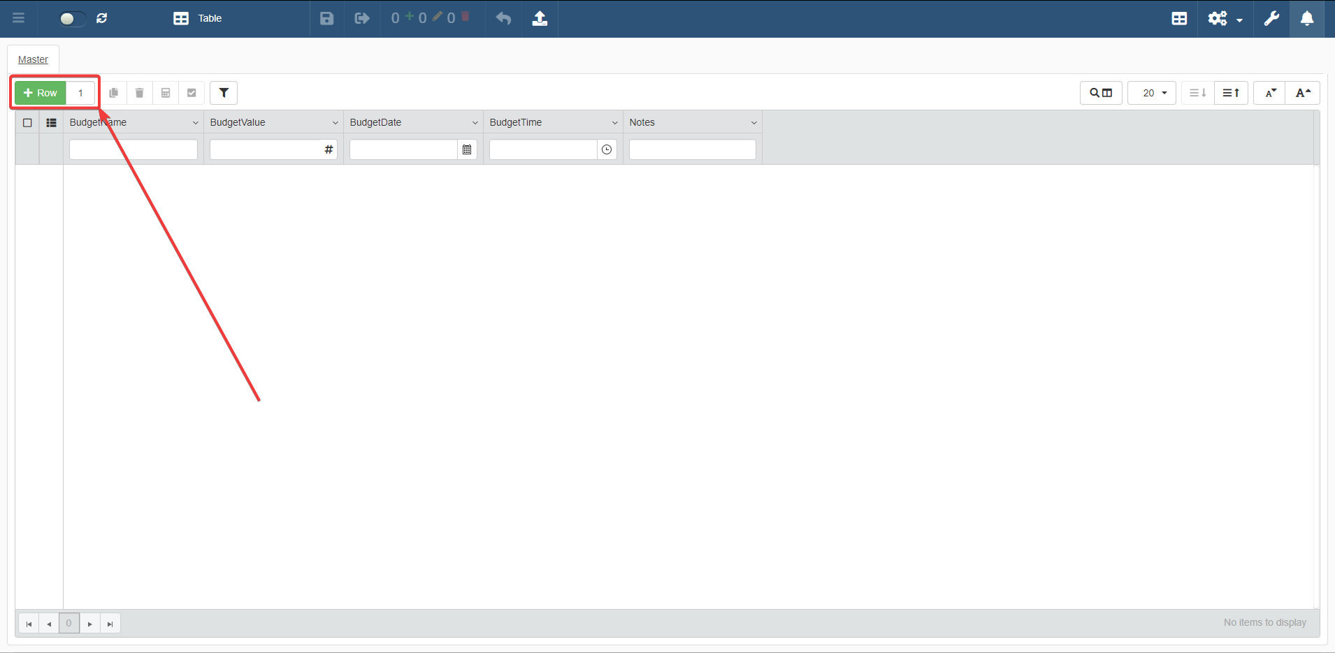 You can create an entry on the Master Table of an application by clicking on Row button. You can find the Row button on the upper-left corner of the table.
