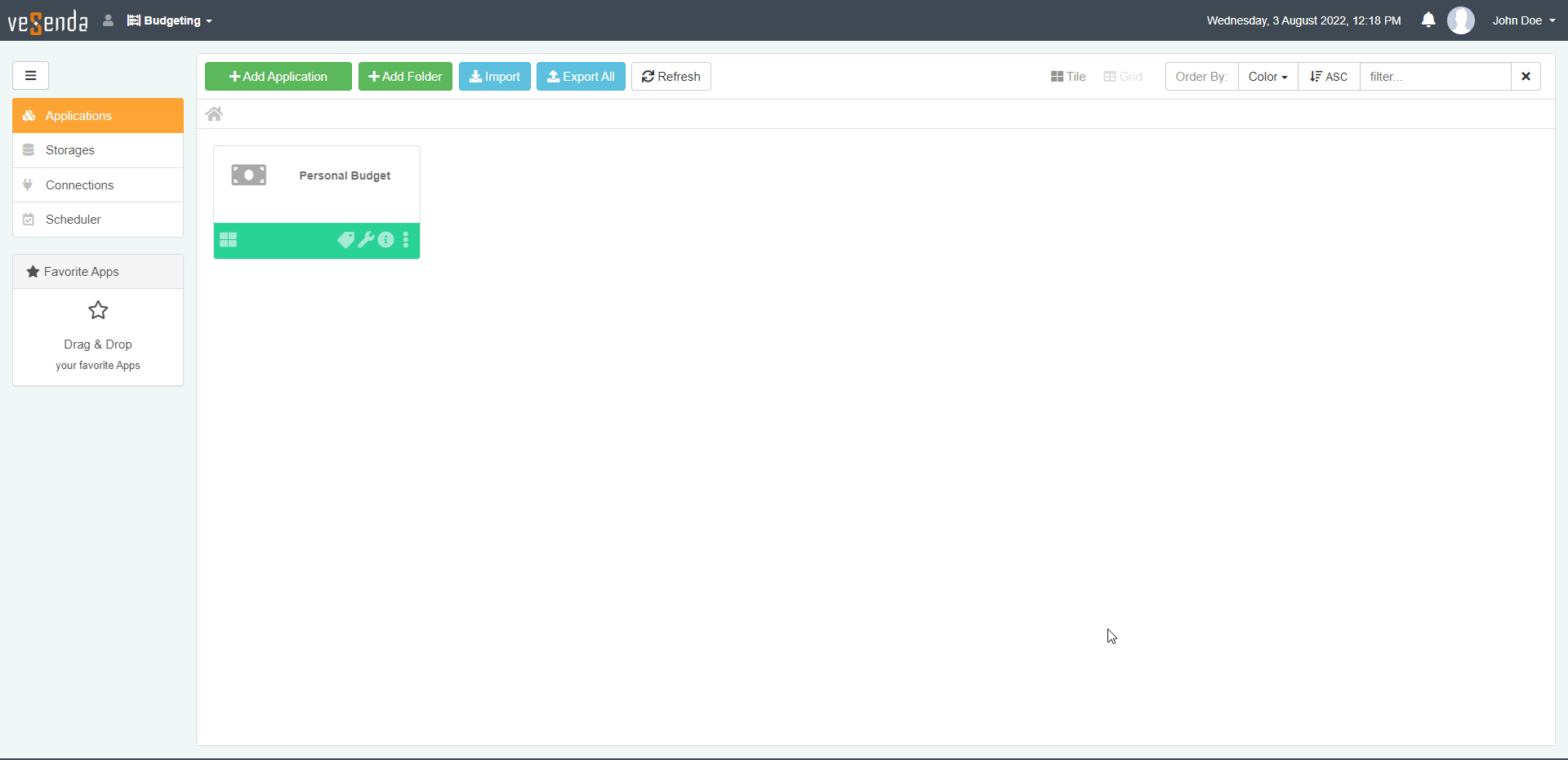 You can enter an eLegere application by clicking on the application's tile in Home > Applications. Open again the Personal Budget application from where you have left.