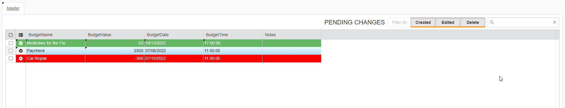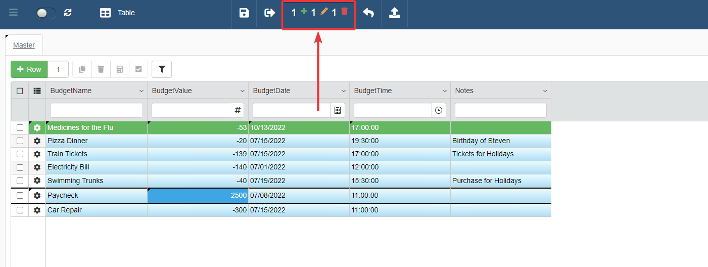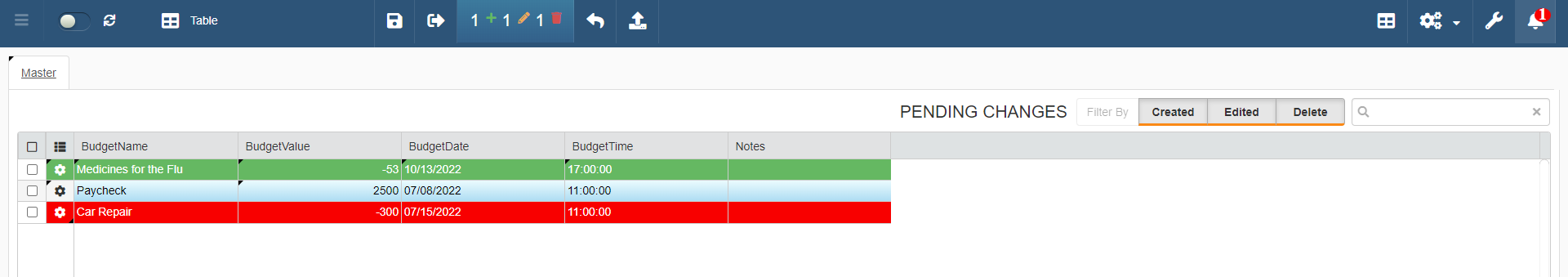 Pending Changes in the top bar mirrors the same color code. The number next to the green () icon counters the new entries. The number next to the yellow () icon counters the modified rows. The number next to the red () icon counters the deleted rows.