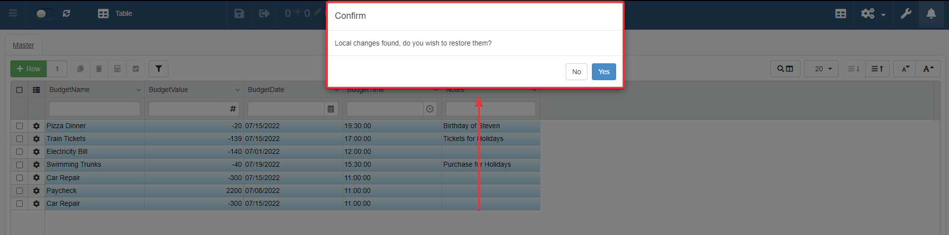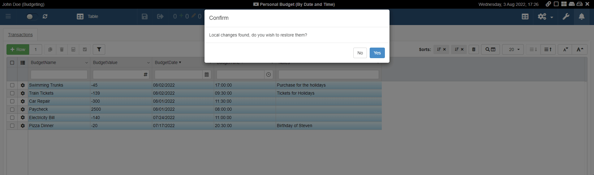 Suppose that you quit Personal Budget suddenly. Personal Budget will remind you about unsaved local changes in the applications when you return. You can decide either to restore or ignore the unsaved changes.