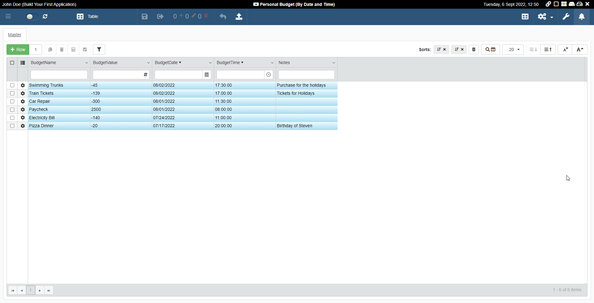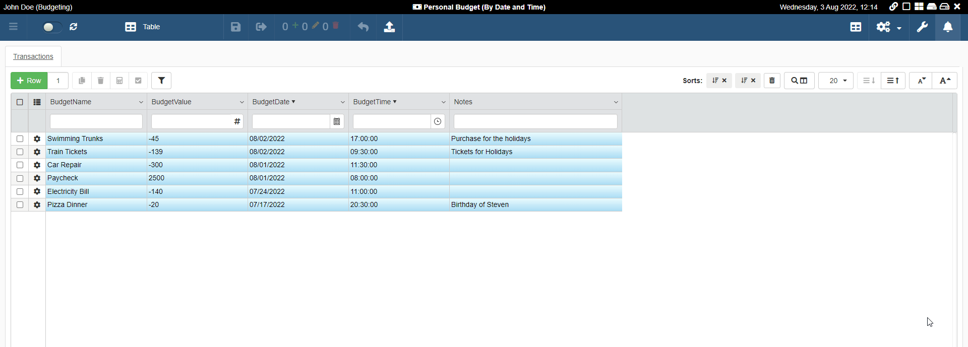 Set up the Sorting for Personal Budget by Descending BudgetDate and Descending BudgetTime fields.