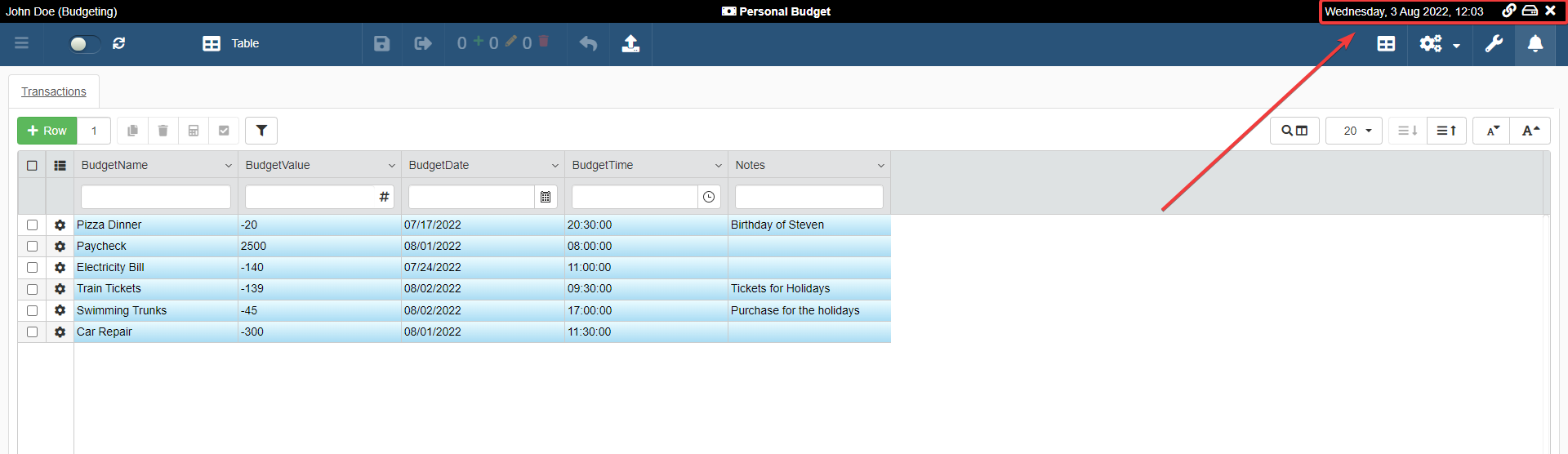 Suppose that you want to enter Personal Budget and find the Date and Time Session loaded automatically.