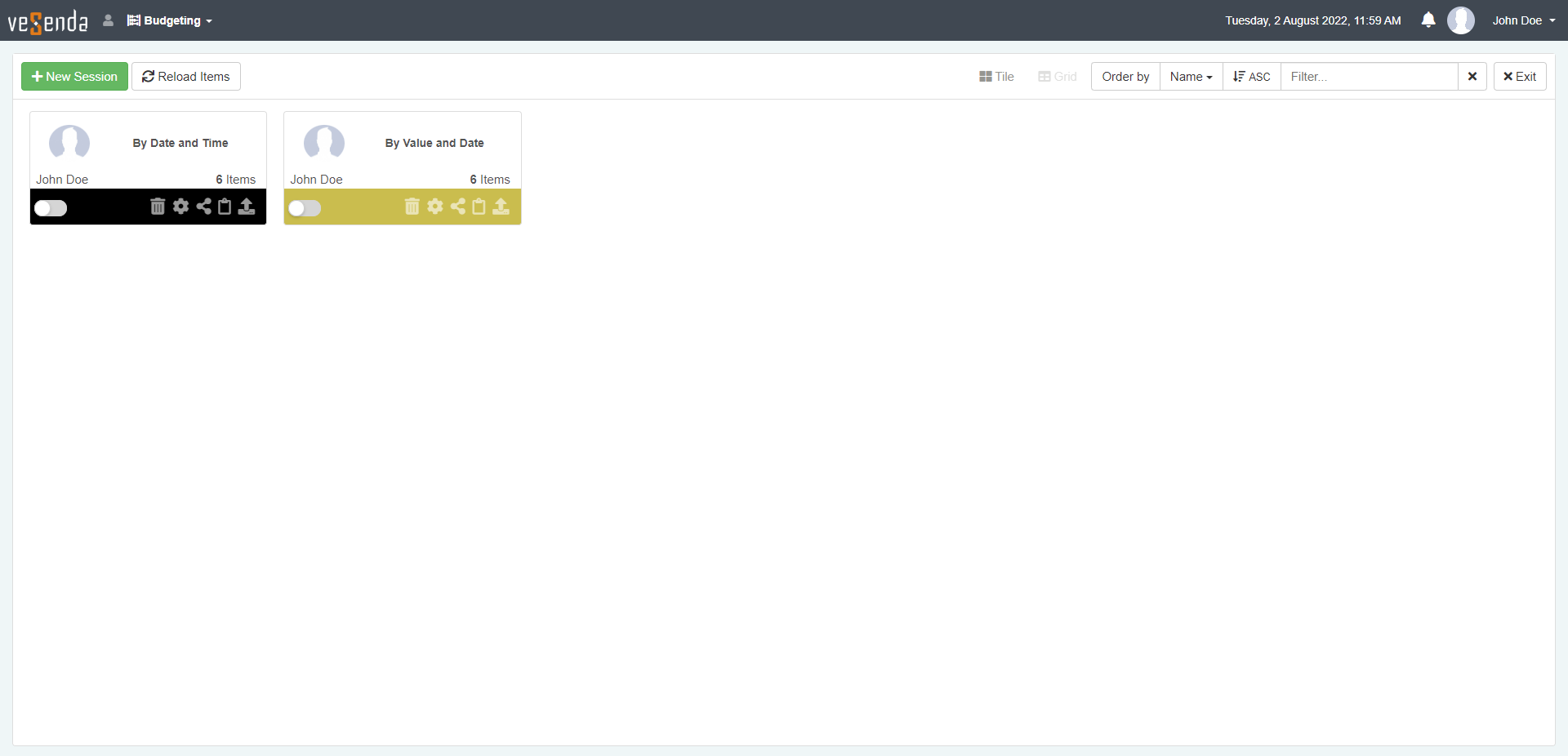 You will access the Session Page. The Sessions Page shows all the Sessions available for Personal Budget and other options (e.g. Export and Sharing options). Also, you can select another Session to be loaded.