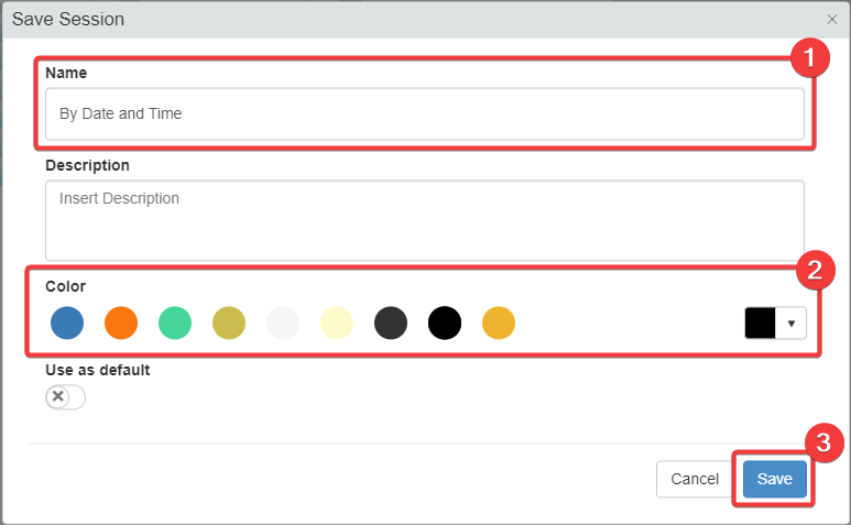 A window will appear where you can type the name of the Session and choose the color. Name the Session
