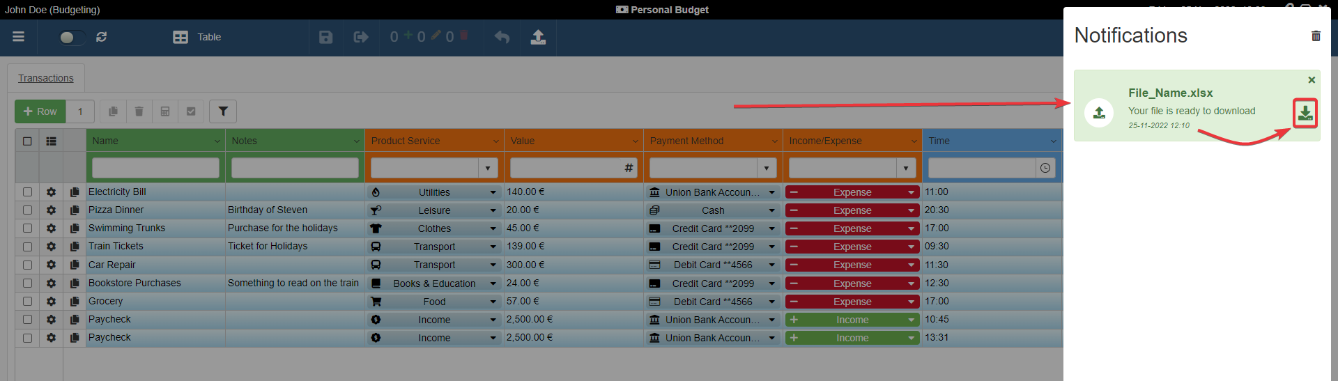 Follow the two steps below to download the exported file from the notifications' list in the application.