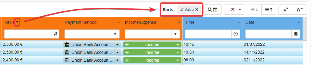 After the selection, an icon will appear next to the header's name. The icon will point the active sorting for the column.