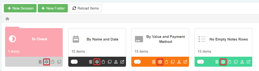In the Sessions Page, click on the Settings button () to access the Session or folder settings you want to change.