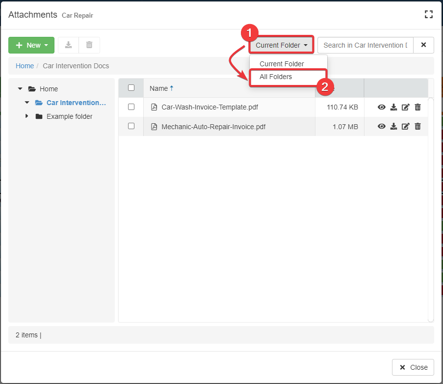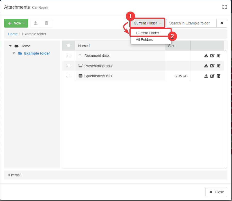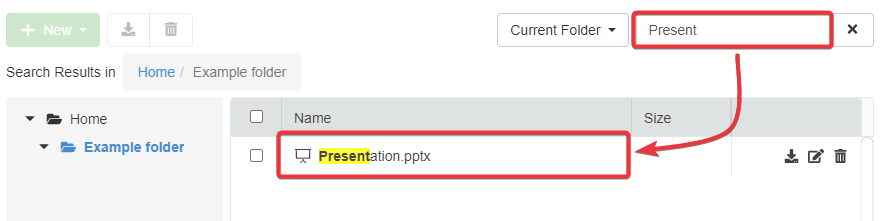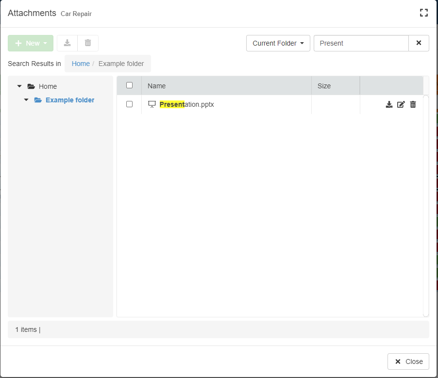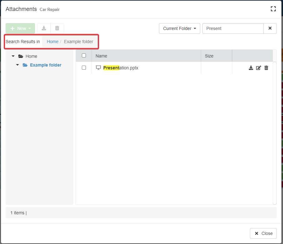 Users can either search the content of the current folder that they are navigating or all the row's attachments.