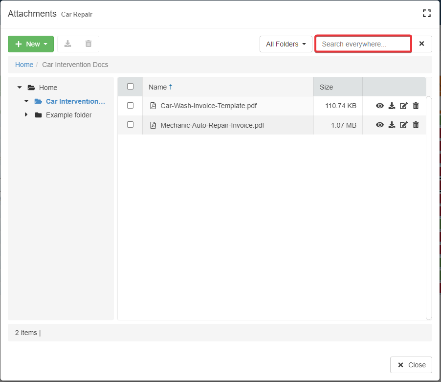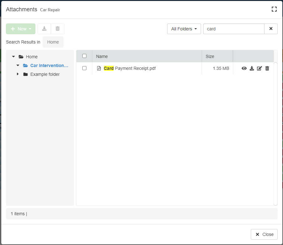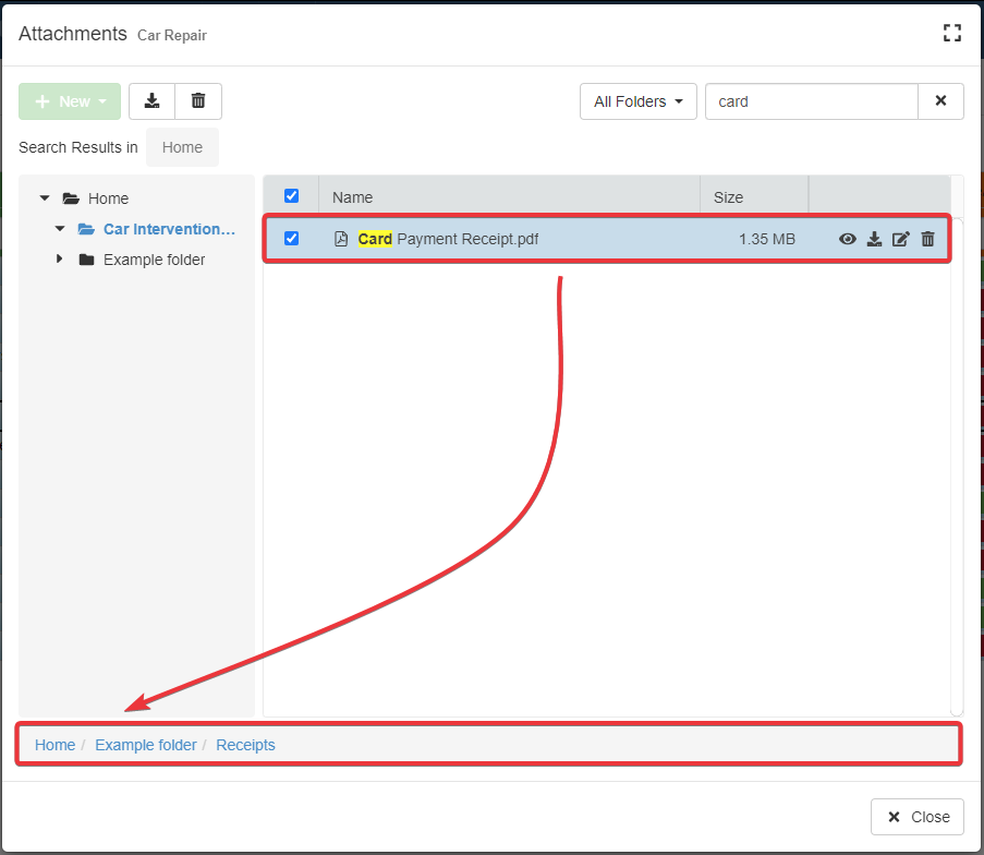 The search bar will look up in the folder for attachments containing the searched words. The window will display all the results corresponding to the search.