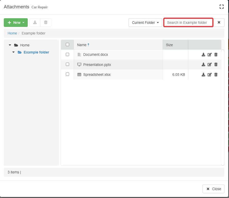If you are in the Home folder of the rows' attachments' tree, the Search function will search all the attachments. You can switch between search in the current folder and all the attachments in any directory different from the Home.