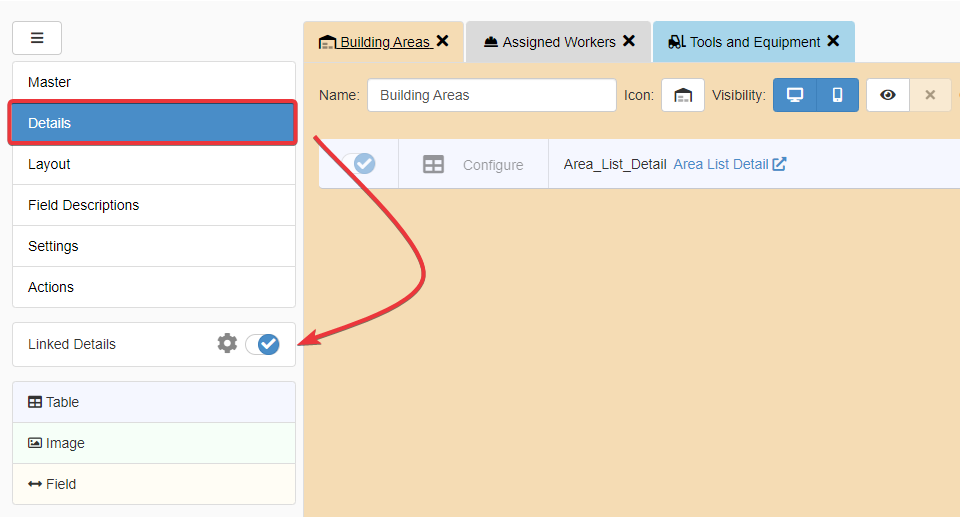 The Designer can link different fields across Detail tables through the new dedicated menu in Design Mode. Designers can enable the Linked Details and related settings in the Details sub-panel.