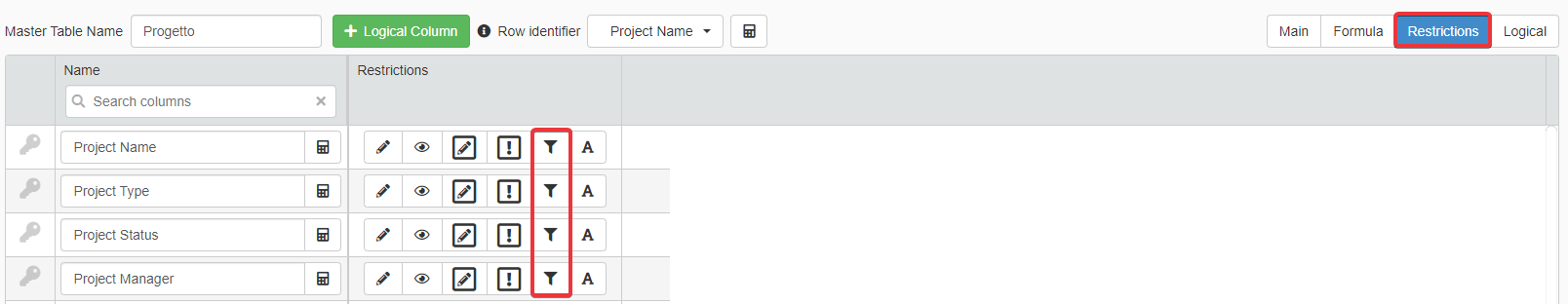 The Column Restrictions () feature enabled to filter rows by a column's value.